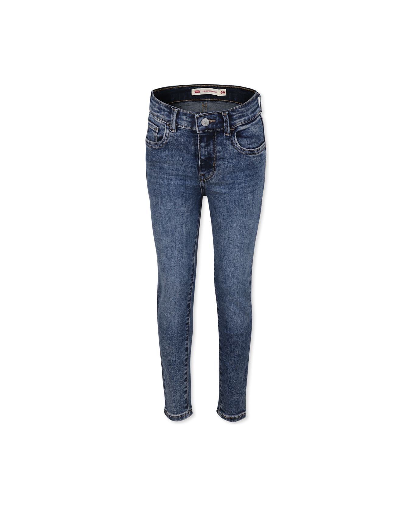 Skinny blue denim jeans, five pockets, with belt loops, front zip and hook fastening and adjustable waist thanks to internal elastic with buttons. They are embellished with a logo patch on the back.
