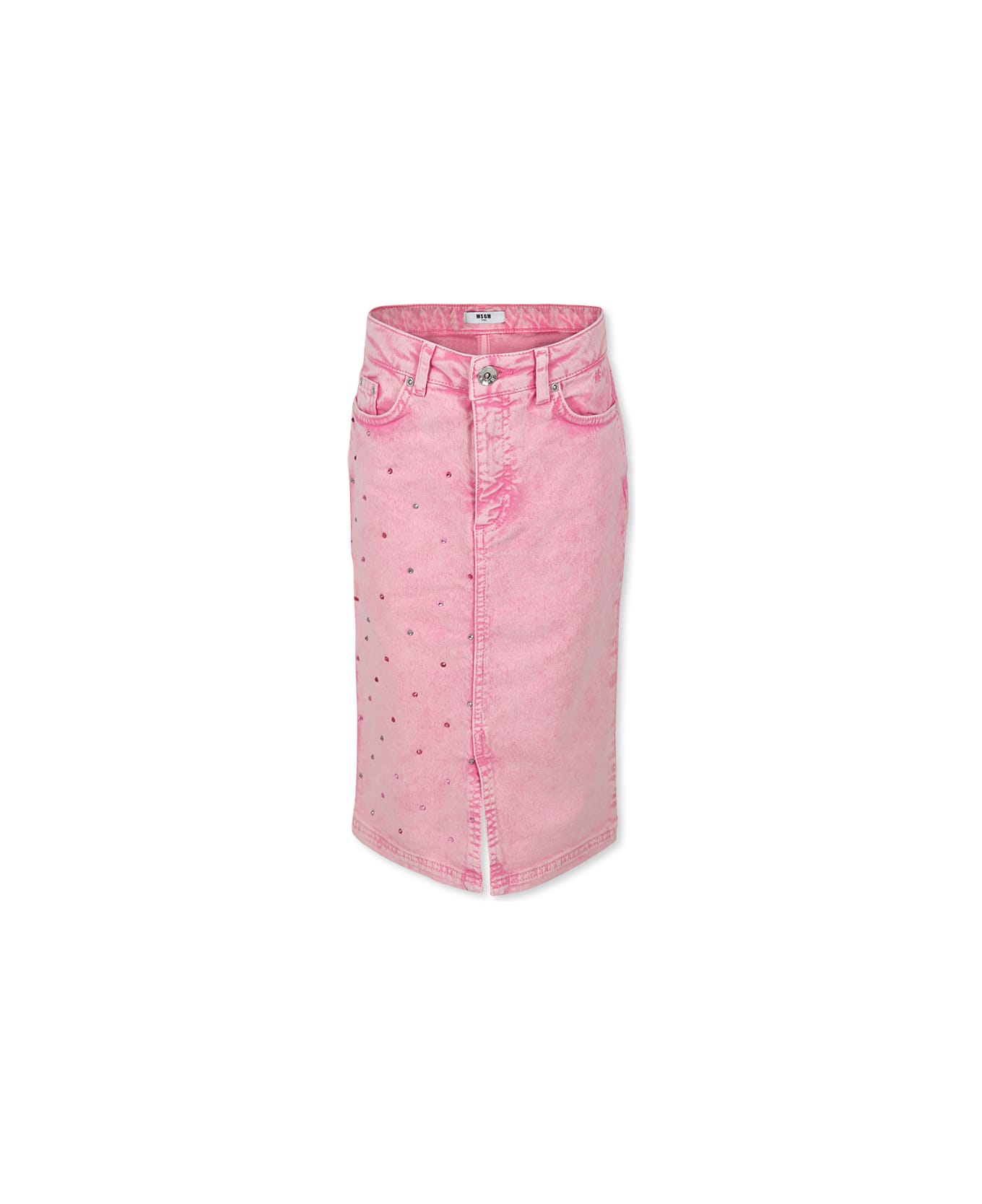 Pink denim pencil skirt with stone washed effect, adjustable waistband, thanks to inside elastics with buttons, five pockets, fastening with button and zip and rip on the front; it is embellished with pink and silver rhinestones, appliqued on the side, logo embroinderied on the inside part of the pocket and white patch with logo on the back.