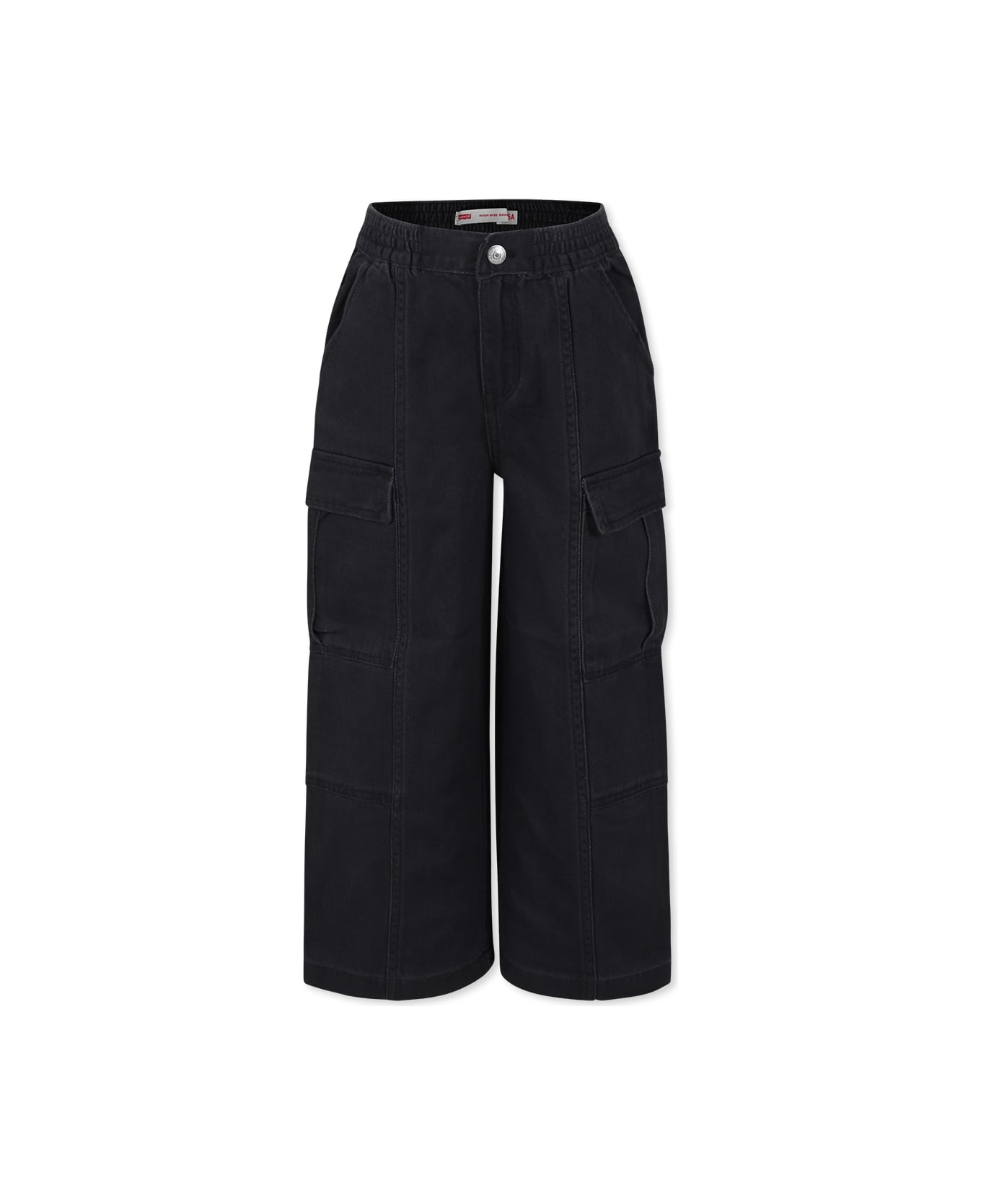 Wide leg black jeans, with side pockets, elasticated waist, zip and button closure on the front, side cargo pockets. They are decorated with a logo patch on the back.