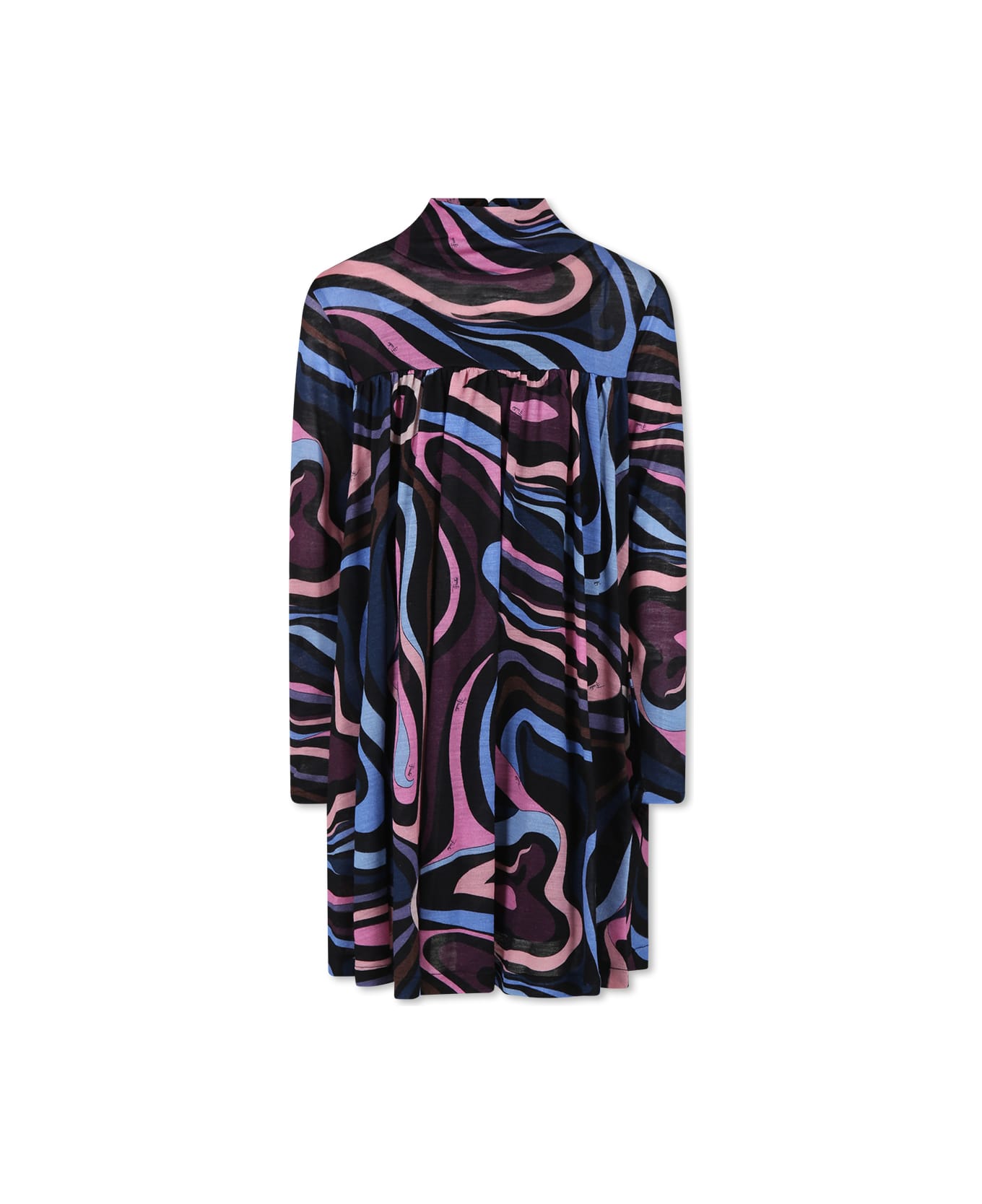 Black wool dress, long sleeves, high neck and stretch cotton jersey slip. It is embellished with multicolor marble print and all-over logo.