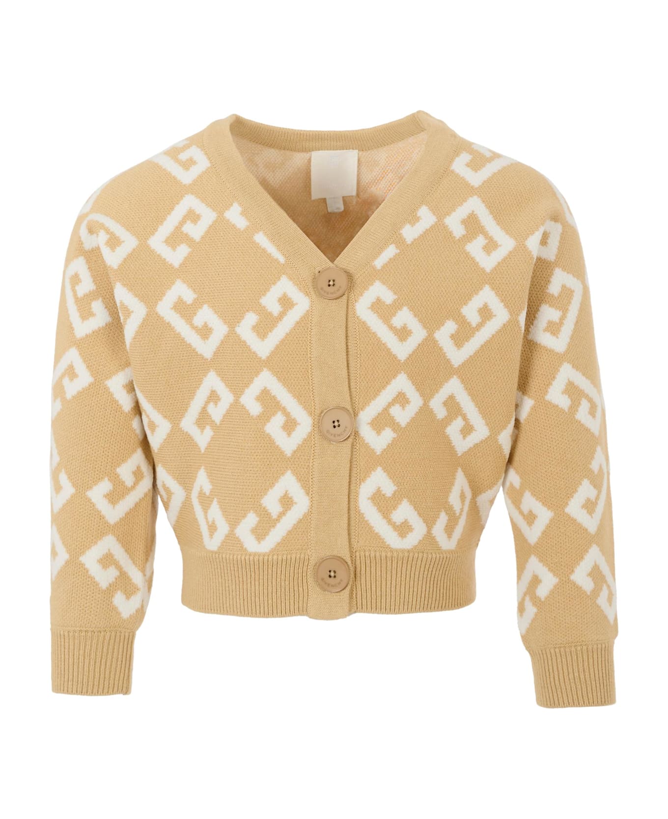 Beige crop cardigan from luxury brand Givenchy Kids has long sleeves, a V-neck, ribbed hem and cuffs, and a button closure at the front. It is embellished with all-over G print.