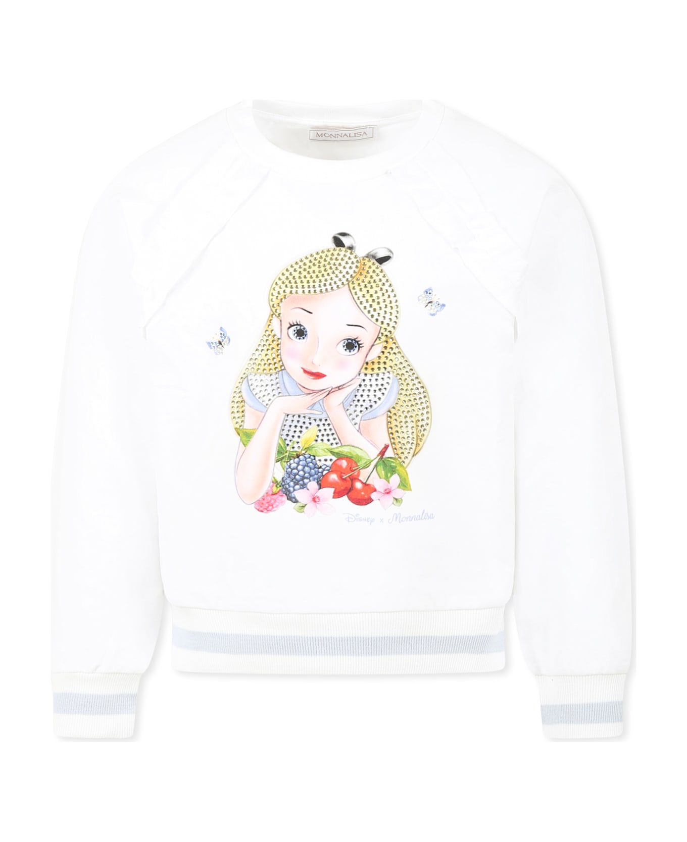 White sweatshirt in brushed cotton blend, long sleeves, with ribbed crew neck, cuffs and hem and ruffles on the front. It is embellished with Alice in Wonderland print and rhinestones on the front. It is a Disney x Monnalisa collaboration.