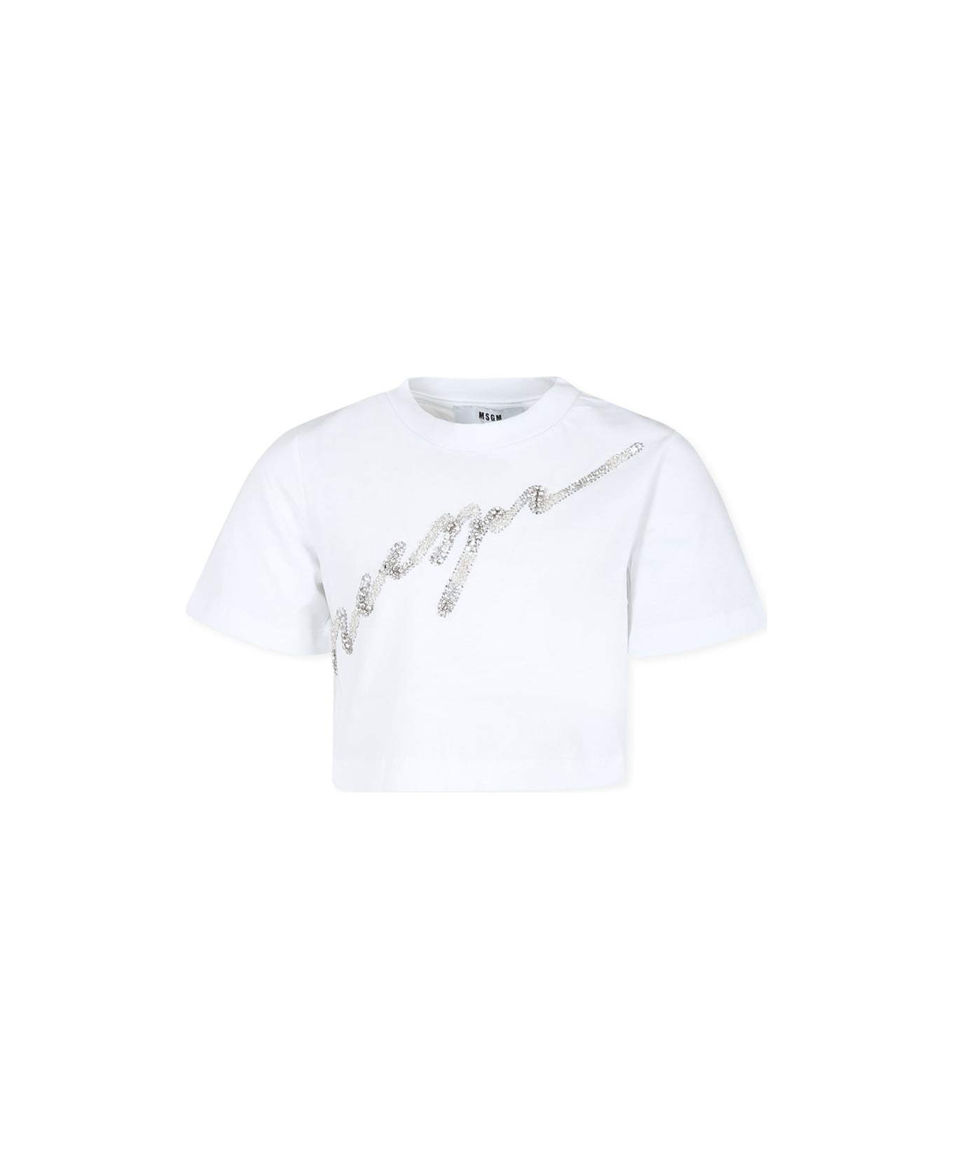 White cotton crop t-shirt, with short sleeves and ribbed crew neck. It is embellished with a front logo with rhinestones, sequins and beads, with a printed logo on the back.
