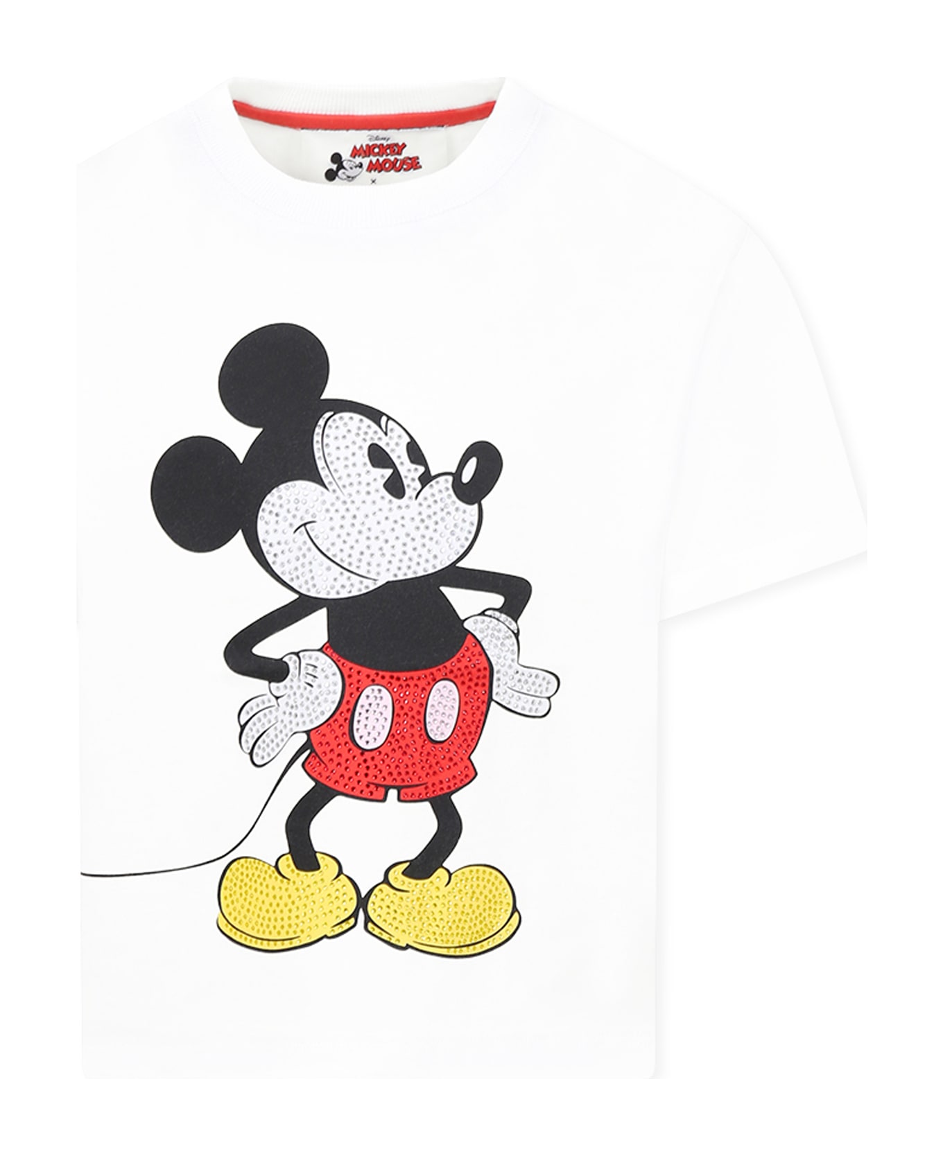 White cotton jersey t-shirt, with short sleeves and a ribbed crew neck. It is embellished with Micky Mouse and rhinestones on the front, print and logo on the back and logoed patch on the side. It is a Disney x Marc Jacobs collaboration.