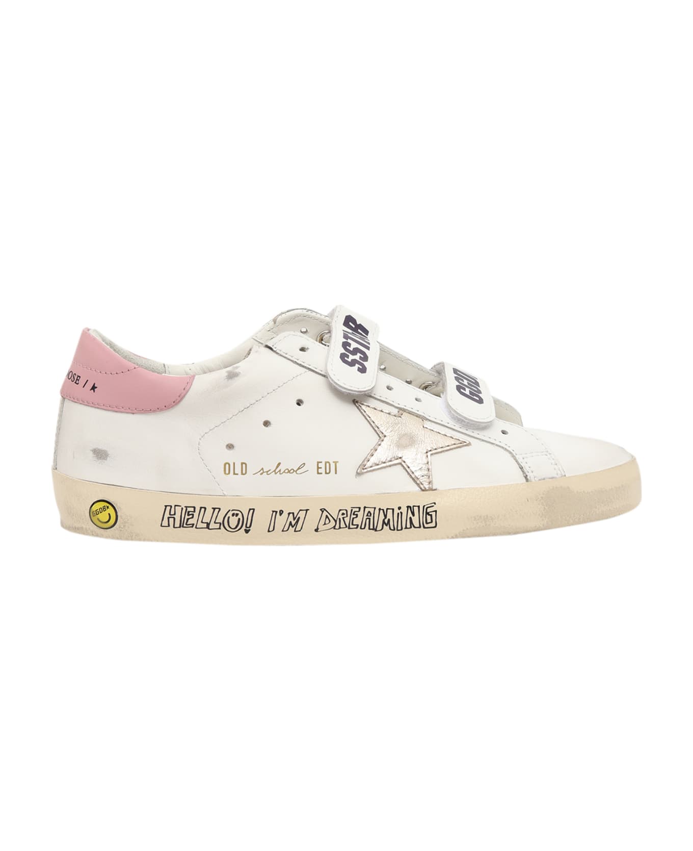 Leather sneakers, logo velcro strap fastening, laminated logo star, vintage effect, contrasting heel tab with logo, print on the side of the sole, smile detail