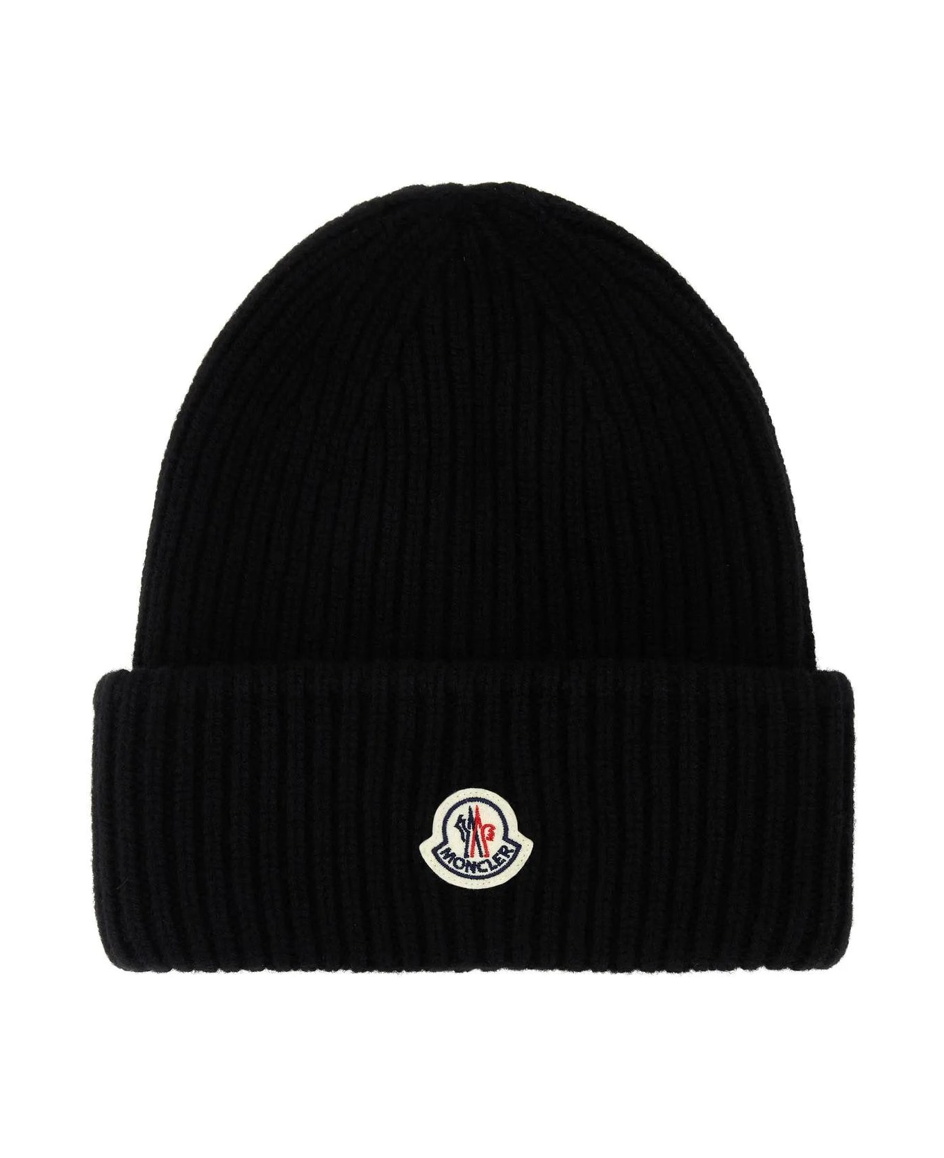Beanie hat realized in ribbed virgin wool and cashmere enriched by contrasting logoed patch at the front.