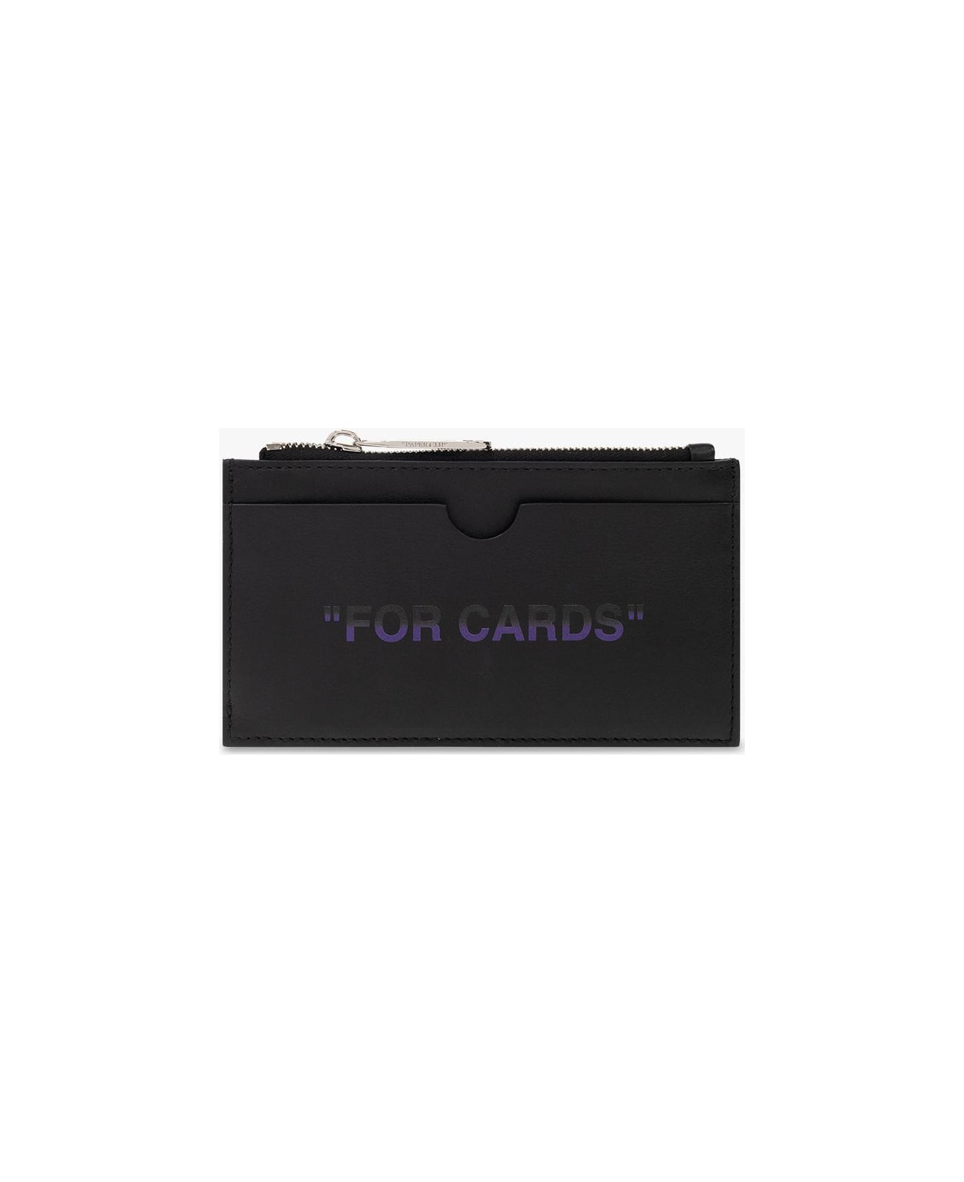 Black card case from Off-White. Made of leather, this item showcases a purple logo print, four card slots, one slip pocket and internal zip pocket.