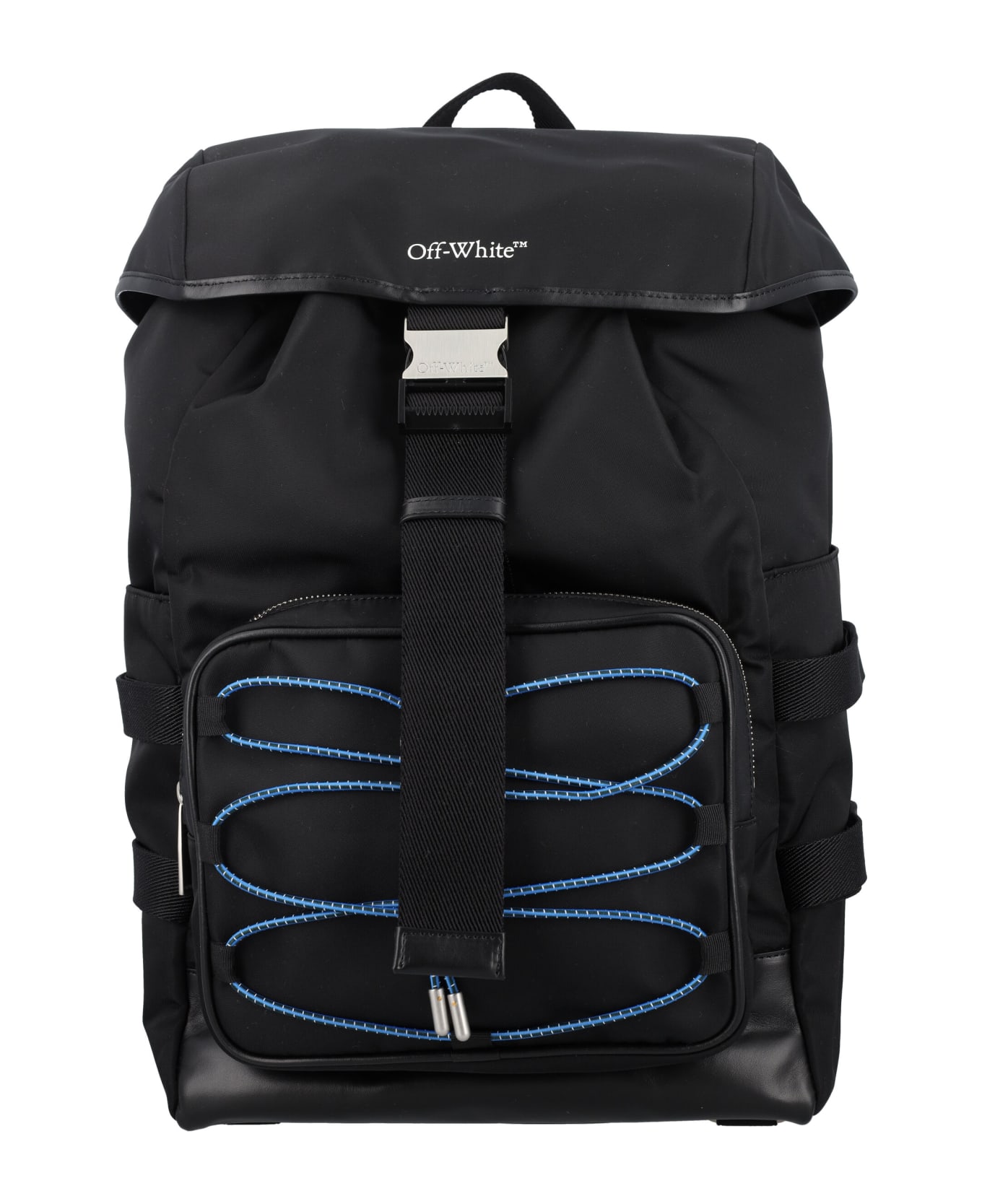 Courrie Flap Backpack By Off-white. Featuring: Black Flap Backpack Top Handle White Off-white Logo On The Flat Pocket At Front Blue Laces On The Zipped Front Pocket Zip Up Pockets Details Side Pockets Adjustable Buckle Closure Adjustable Straps Height: 43cm Width: 26cm Depth: 15cm