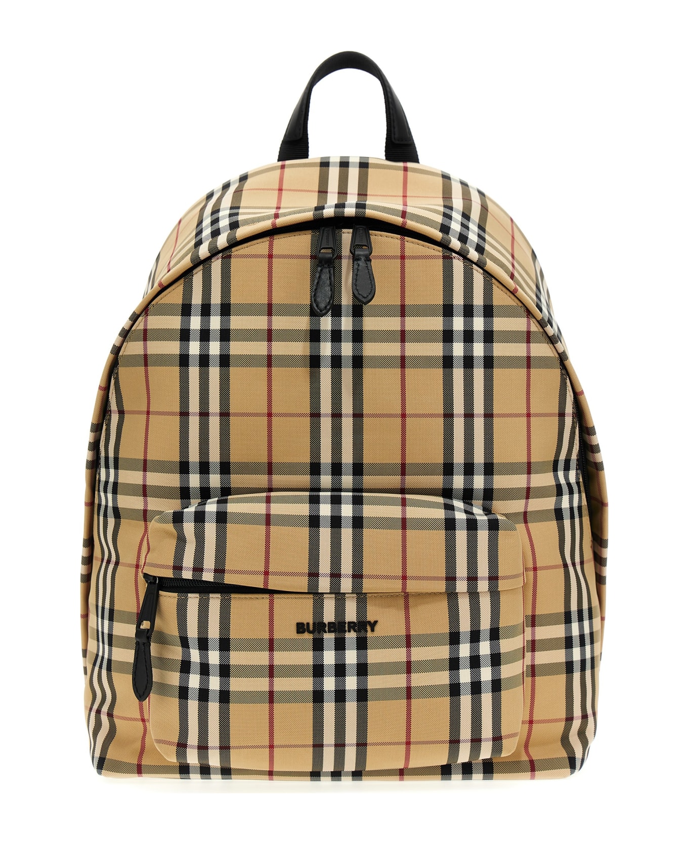 Burberry Check 'Cashmere' backpack with top handle, adjustable shoulder straps, external zip pockets, double zip slider closure and a front logo. : The main material of the product is made of at least 30% materials of biological origin. Biological materials are derived from renewable natural resources, such as plants or castor oil.