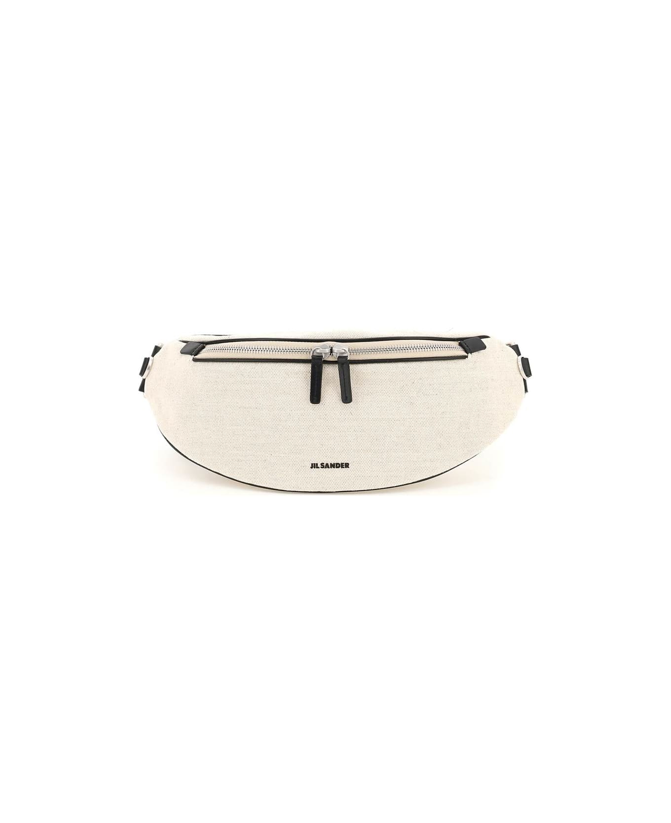 Jil Sander small belt bag crafted in canvas with leather piping and front contrasting logo print. Adjustable leather belt, two-way zip closure, leather lining and one inner small pocket. Silver-finished metalware.