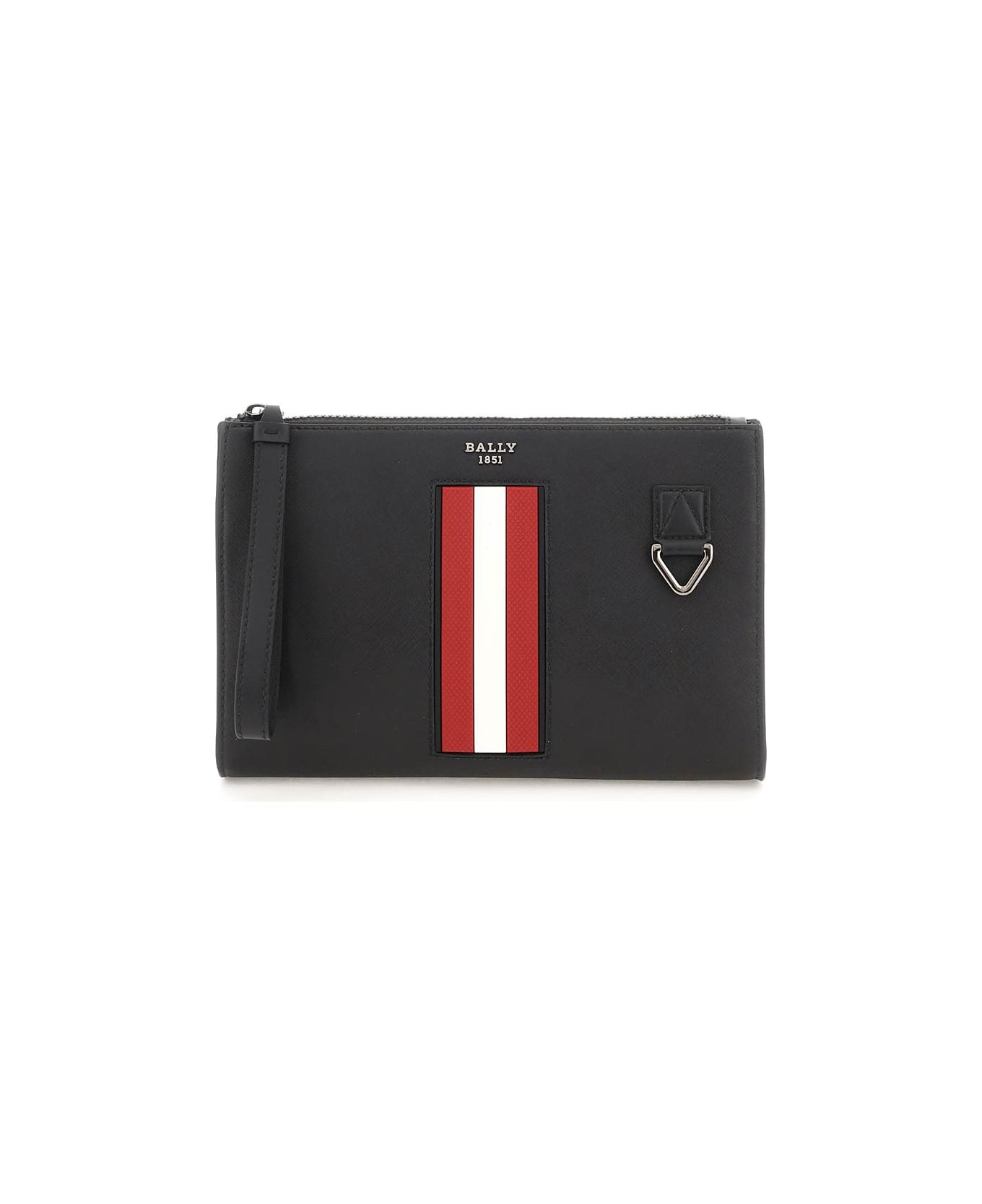 Makid pouch by Bally in coated leather with Bally Stripe rubber insert, triangular metal key ring and metal logo on front. Top zip closure with leather wrist handle on the zip puller. Branded fabric lining and three inner open flat pockets. Ruthenium-finished metalware.