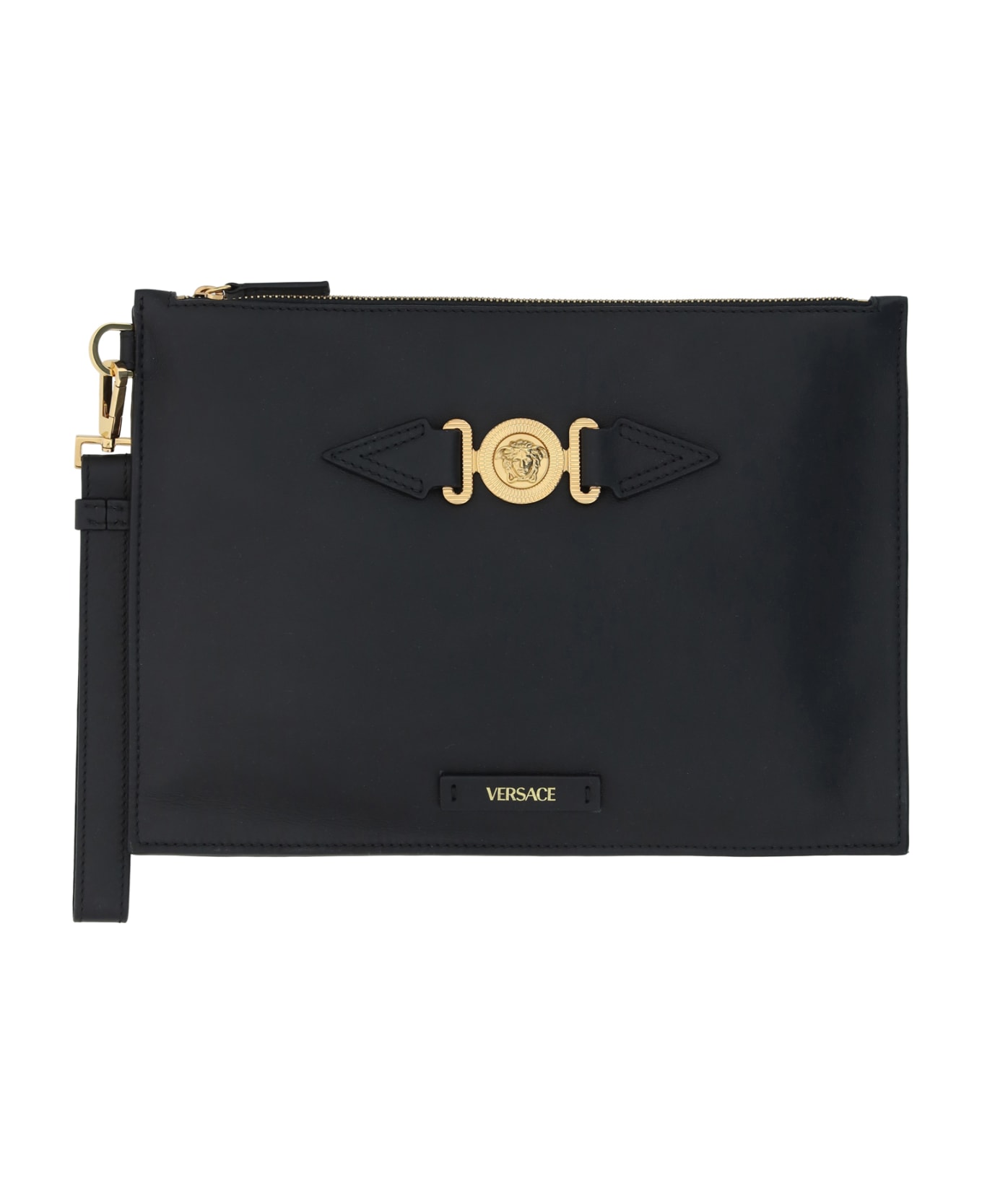 Calfskin clutch bag by versace, top zipper closure, removable puller for carrying it by hand, plaque with the brand's iconic medusa applied to the front, inside welt pocket. Composition: 100% % Calf Leather Bos Taurus