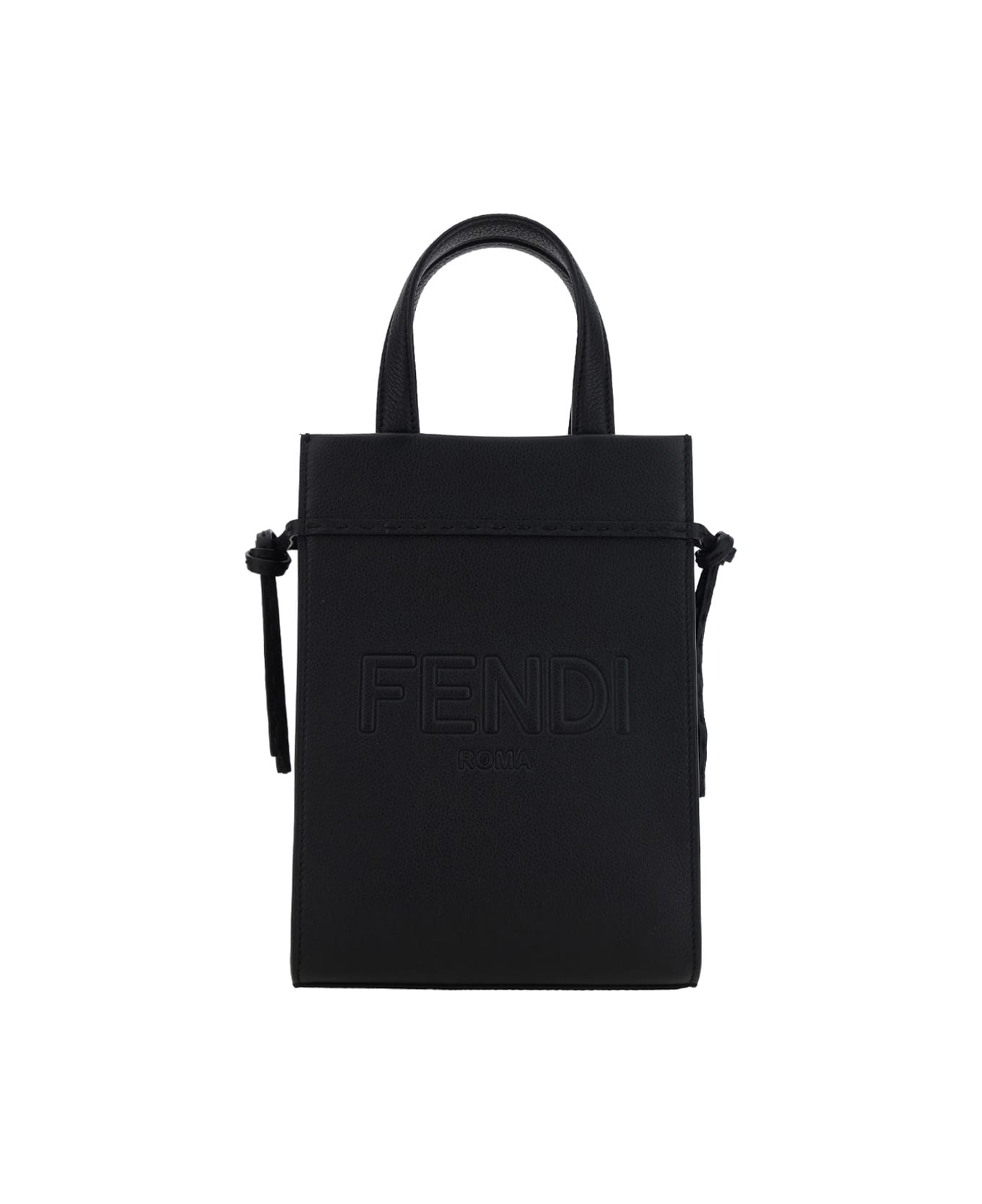 Calfskin shopper handbg by fendi,removable and adjustable contrasting webing shoulder strap, double flat top handles, interior magnetic button closure, iconic fendi roma press-stamped logo on front, tassels with knotted detail on side panels.