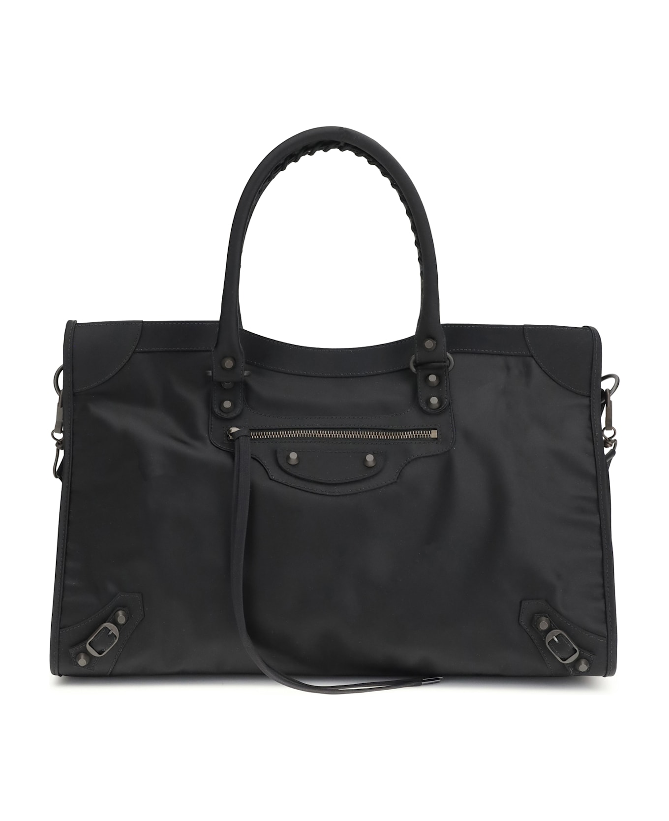 The le city grande handbag by balenciaga combines handcrafted elegance and practicality, with two hand-woven handles and a removable, adjustable shoulder strap. brass hardware enhances the design, while the zippered closure and knotted nylon pull ensures security. the model features a front zippered pocket with knotted nylon puller and an interior zippered pocket, combining functionality with distinctive style.