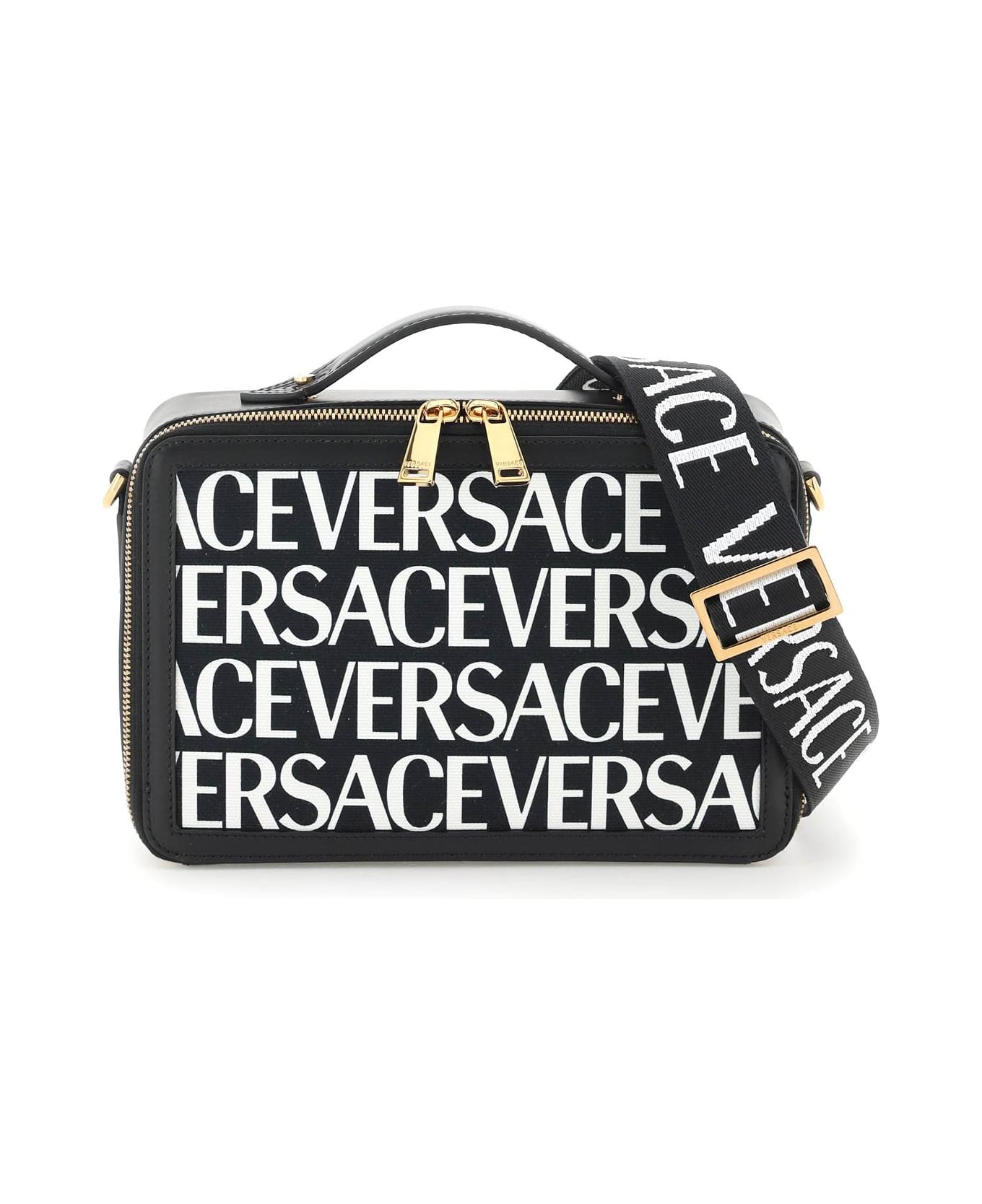 Versace cotton canvas crossbody bag with all-over contrasting lettering logo and leather trims Two-way zippered closure, fabric interior with one open pocket and eight leather credit card slots, top handle, and adjustable, detachable shoulder strap and gold-finished metalware.