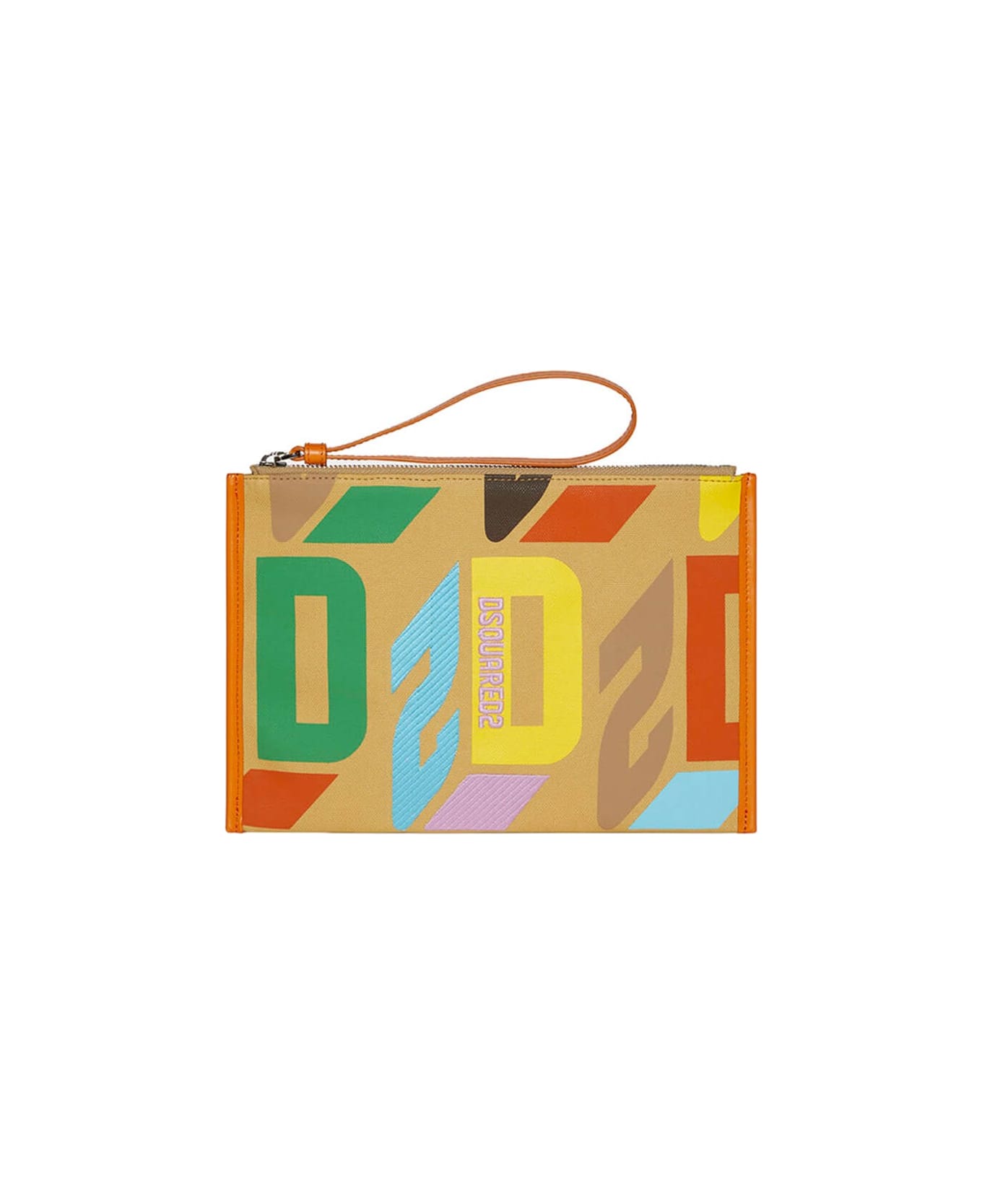 D2 Monogram clutch bag by Dsquared2 made of canvas with multicolor monogram motif. Cotton lined interior, zip closure with leather wrist strap. Measures 18x26cm. Composition: 100% cotton. Lining: 100% cotton.