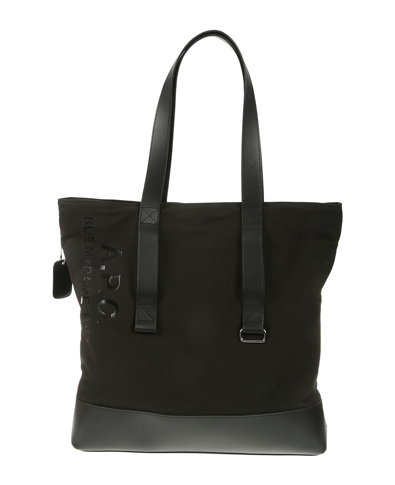 A. P. C. Black cotton bag, leather base, leather handles, logo detail, zip closure.