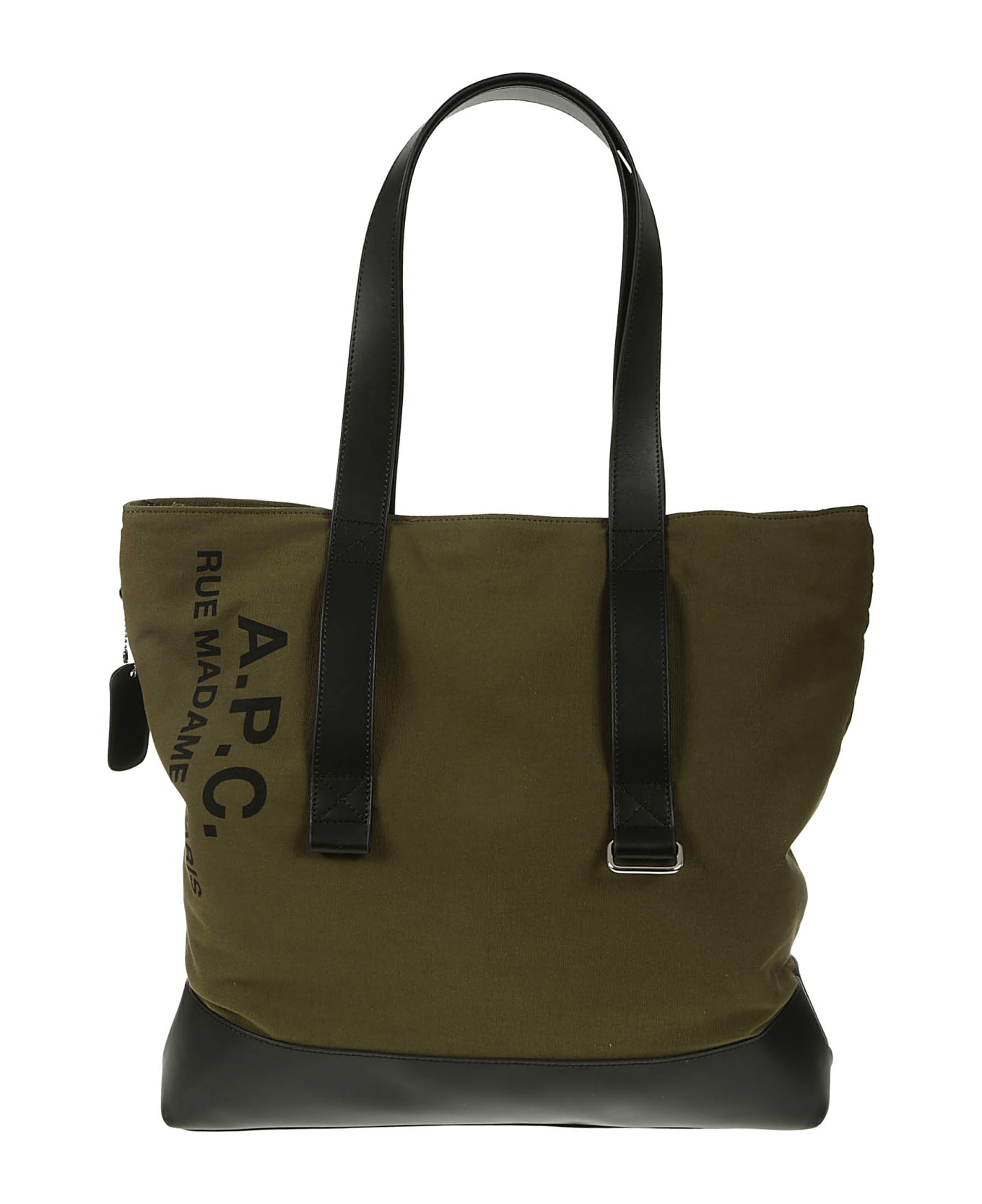 A. P. C. Green cotton bag, leather base, leather handles, logo detail, zip closure.