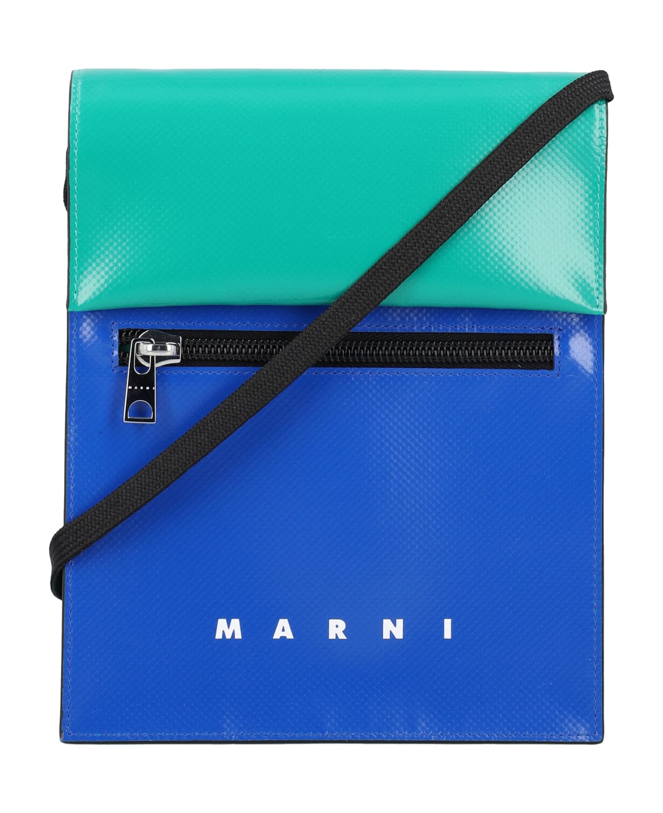 Pvc Two Tone Tribeca Messenger Bag By Marni. Featuring: - Flap Compartment With Snap Buttons Cloasure - Logo Print At Front - Front Zip Pocket - Rear Pocket - Detachable And Adjustable Nylon Shoulder Strap Height: 20 Cm Width: 16 Cm Depth: 3,5 Cm