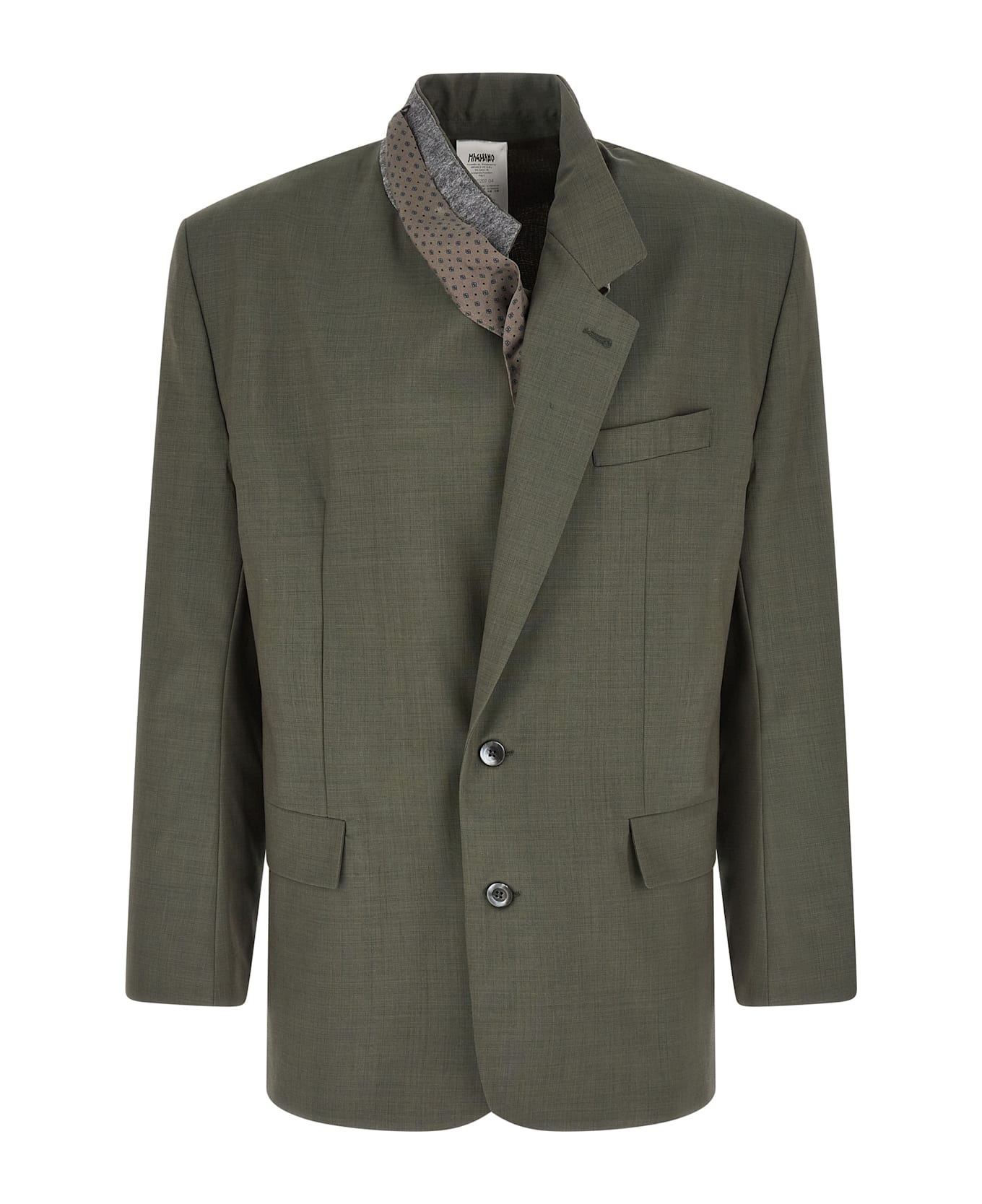 'Dawn Rimini' single-breasted virgin wool Marzotto blazer with front mother-of-pearl button closure, mirror lapels, viscose and silk blend scarf patterned in the removable underneck, breast pocket, flap pockets, structured shoulder strap, cuffs with open buttonholes, viscose and cotton blend lining, two inner pockets.