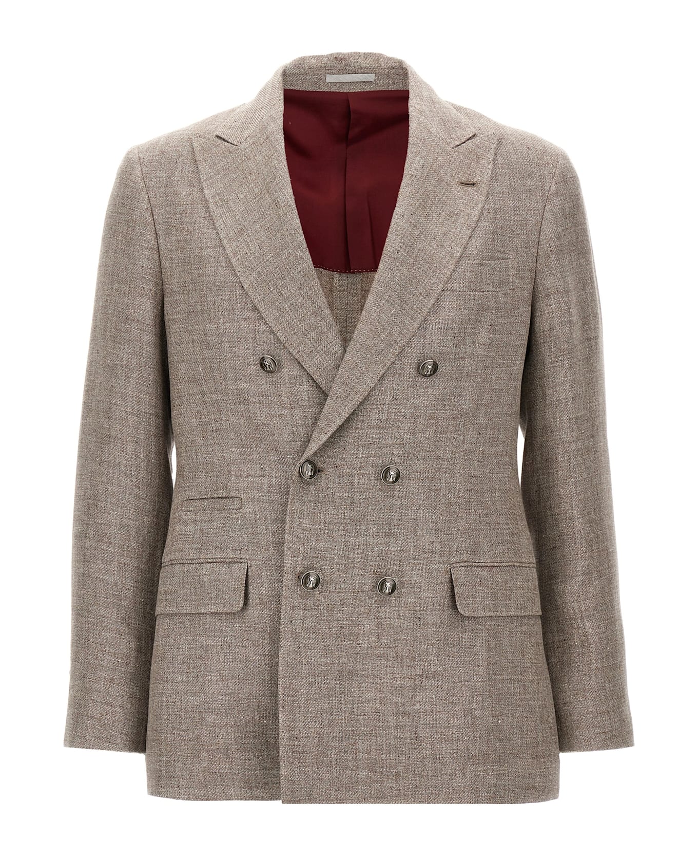Deconstructed diagonal blazer of linen, wool and silk with a flamed texture, one-and-a-half breast model with 6-button closure, peak lapels, flap pockets, ticket pocket and chest pocket, two internal pockets with button closure and pen pocket, 'Spalla Solomeo', cuffs with opening buttonholes, half cupro lining, back vents.