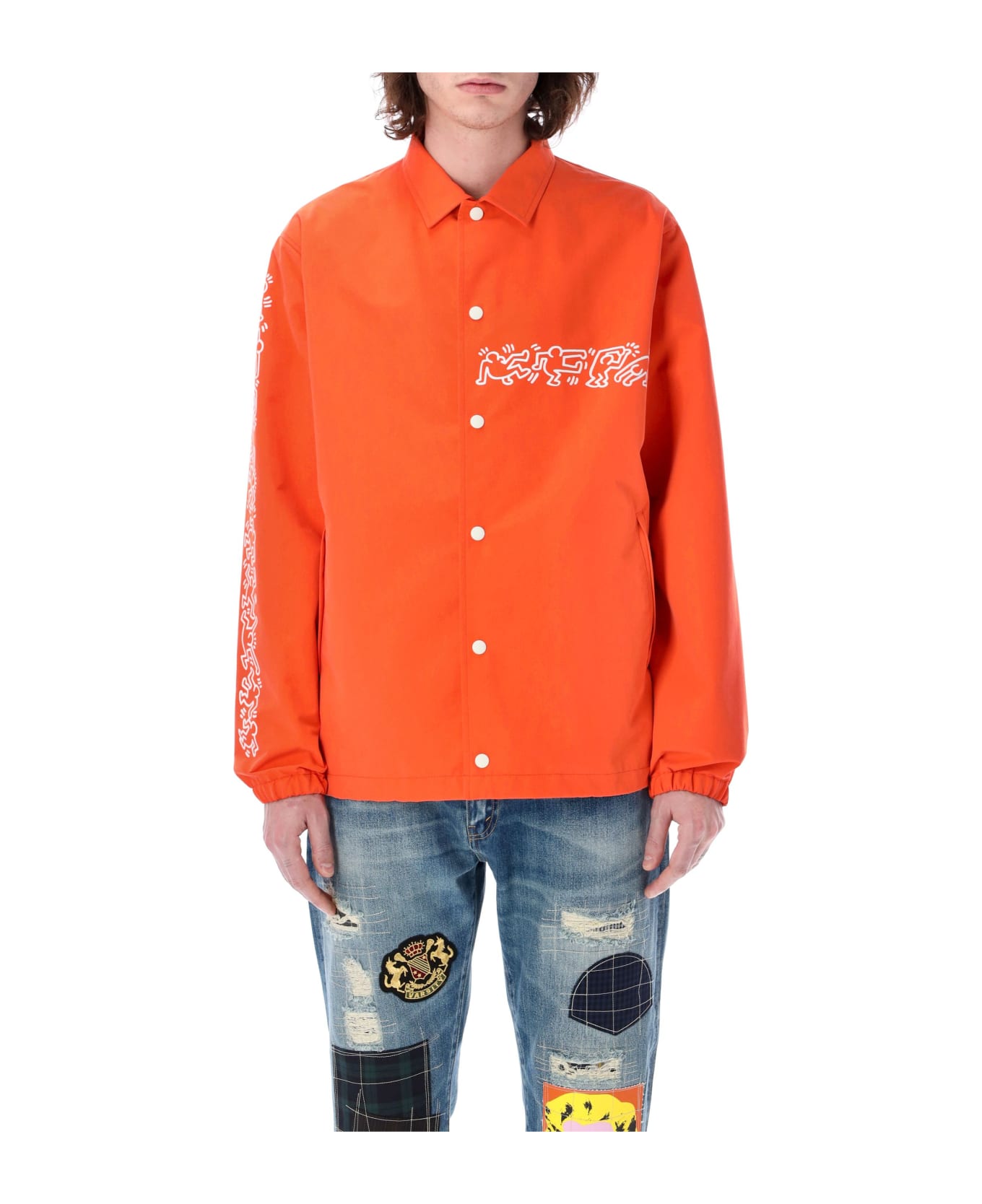 Keith Haring Shirt Jacket By Junya Watanabe. Featuring: Point Collar Front Snap Button Fastening Printed Graphic At Left Chest And Right Sleeve Slit Pockets Long Sleeves Elasticated Cuffs Straight Hem With Drawstring Model Is 1,90 M Tall And He Is Wearing Size Xl