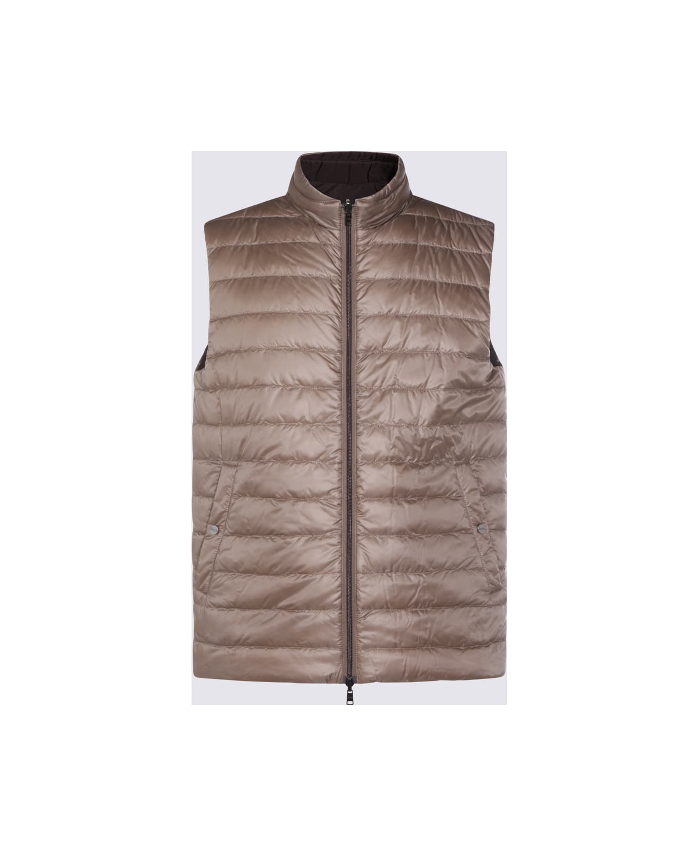Beige and brown reversible down jacket from Herno featuring high collar, zip fastening, sleeveless, welt pockets with button closure, padded and regular vestibility. Composition: _, 100% Polyamide