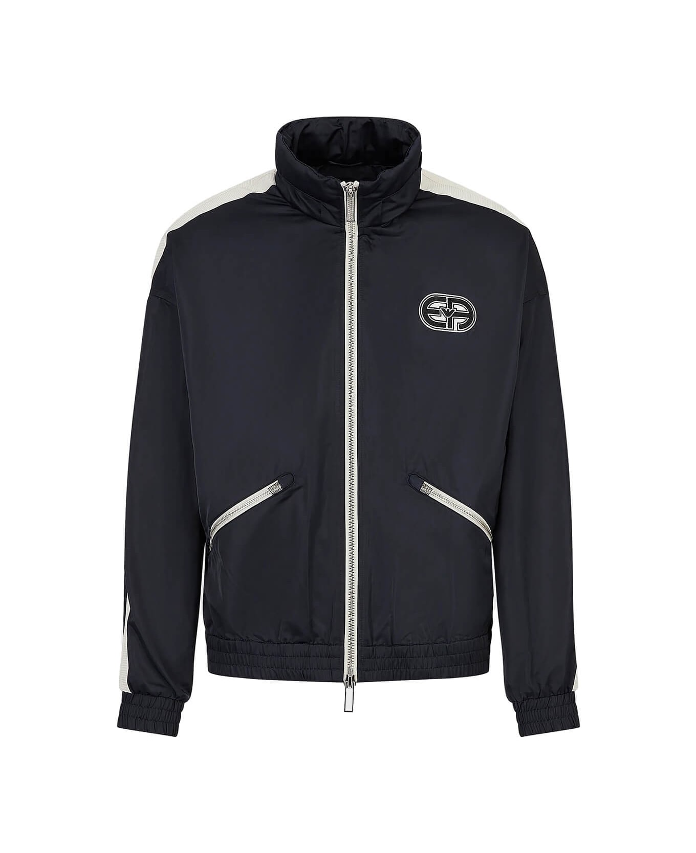 Emporio Armani bomber jacket made of blue recycled polyester with contrasting inserts on the sleeves. Logo patch on the chest, hood with hidden drawstring in the collar. Slanted pockets on the front, zip fastening and elasticated cuffs and bottom. Composition: 100% recycled polyester.