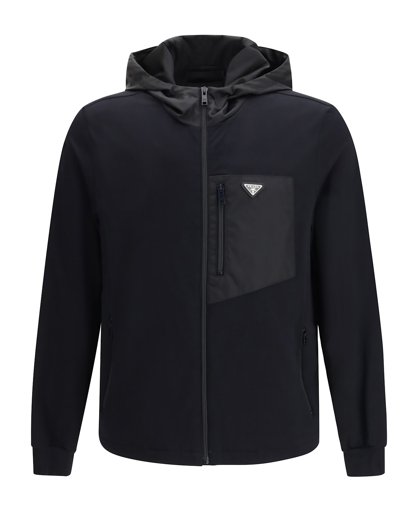 The hooded jacket by prada features a front zip fastening and a functional, contemporary design. it is designed with three pockets: two side zip pockets and a single pocket crafted in contrasting material, enhanced by an applied metal logo plaque that adds a distinctive and recognizable touch. the hood completes the piece, combining practicality with refined aesthetics. Composition: 90% % Cotton, 10% % Elastane