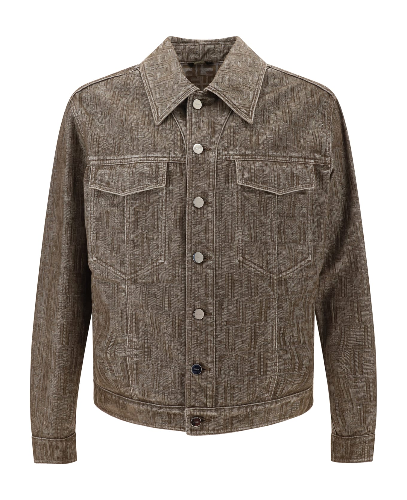 Cotton jacket by fendi, velvet-effect denim design, classic collar, front closure by logo buttons, two flap pockets with buttons for closure applied to the front, adjustable cuffs by buttons, iconic all-over repeated brand logo, regular fit.