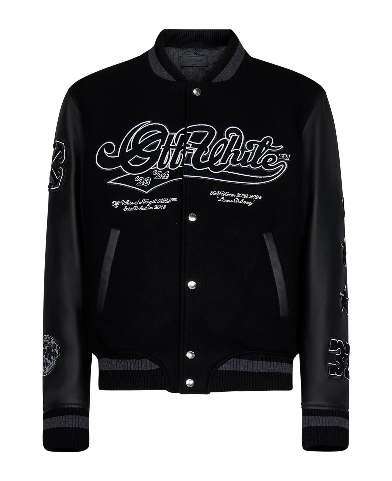 • Ribbed knit bomber collar with contrasting striped pattern; Long tone-on-tone leather sleeves, black and white patches with Arrow, moon and logo motifs embroidered at sleeves