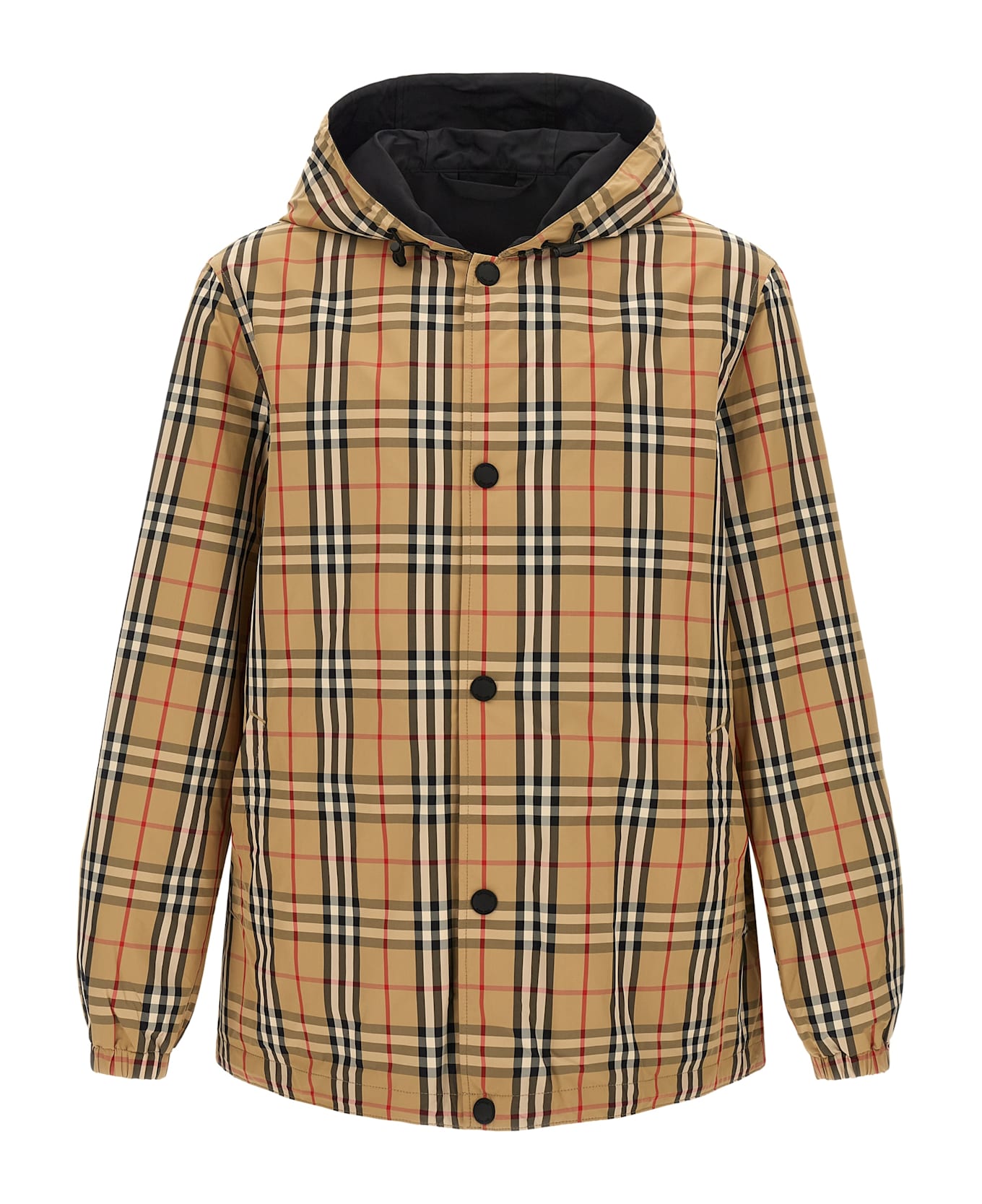 Solid color reversible 'Rainford' nylon jacket with tone-on-tone silicone 'Equestrian Knight Design' patch and Burberry Check, adjustable hood, front snap button closure, pockets, long sleeves with elastic cuffs, drawstring at the hem.