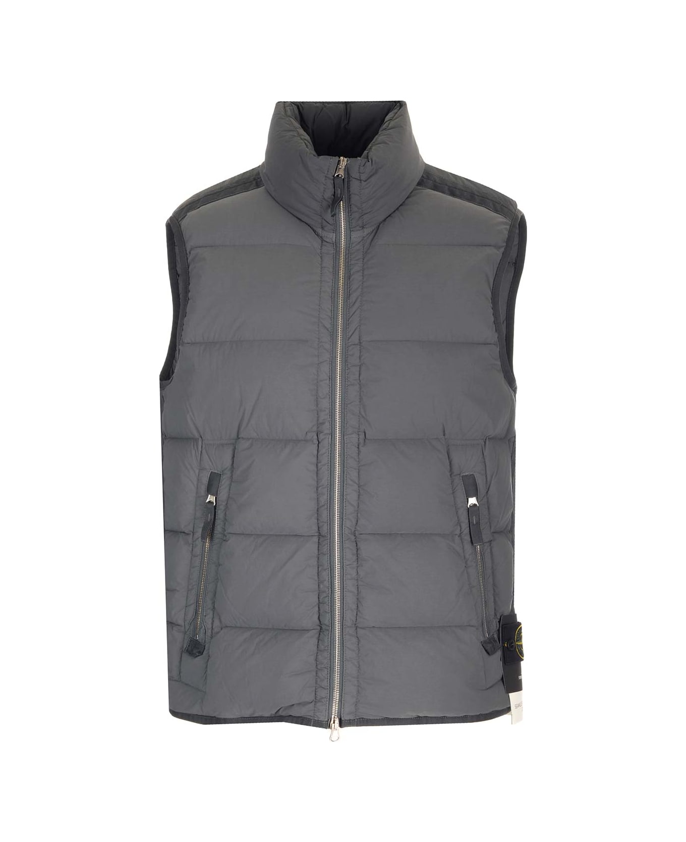 Gray down padded vest by Stone Island with zip closure, two side zip pockets and side logo patch. Composition: 84% PA 16% EA 90% DD 10% FD