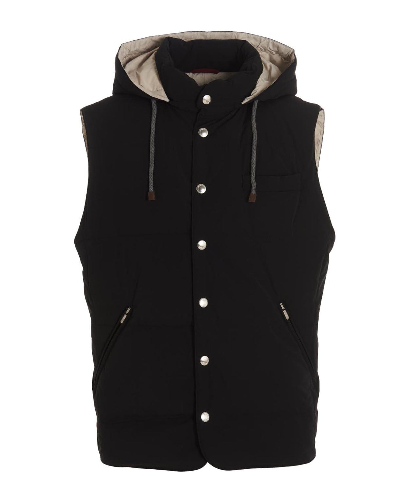 Down padded nylon vest with removable hood, pockets and a button closure. Composition: 83% polyamide 17% elastane