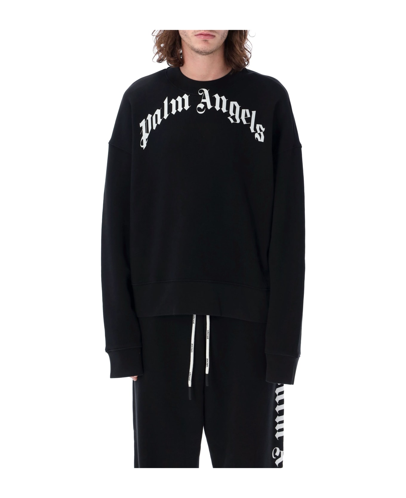 Cotton Curved Logo Sweatshirt By Palm Angels. Featuring: Ribbed Crew Neck Long Sleeves Drop Shoulder White Logo Print At Front Rib Trims Loose Fit The Model Is 1,90 M Tall And He's Wearing Size L
