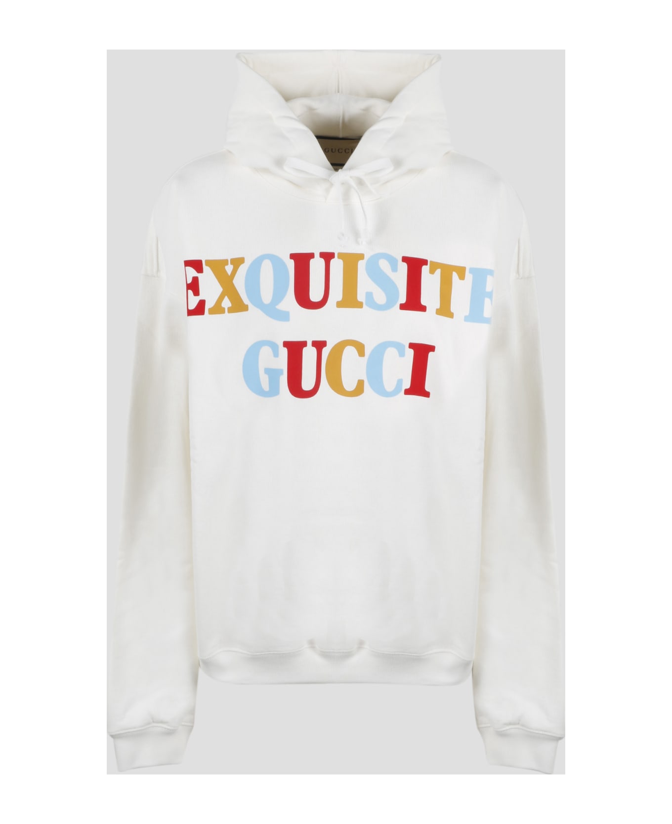 Gucci jersey cotton hoodie, with contrasting print on the front and back. - SS23 - Regular fit - Drawstring hood - `Exquisite Gucci` print on the front - Exquisite Gucci characters print on the back - Ribbed cuffs and bottom - Made in Italy - 100% Cotton