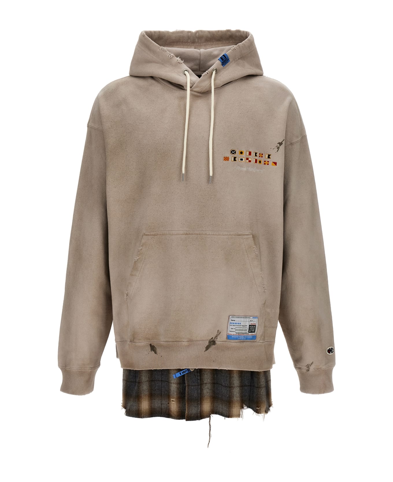 'Triple Layered' hoodie in used and distressed effect cotton, check flannel insert, kangaroo pocket, front embroidery, long cuffed sleeves.