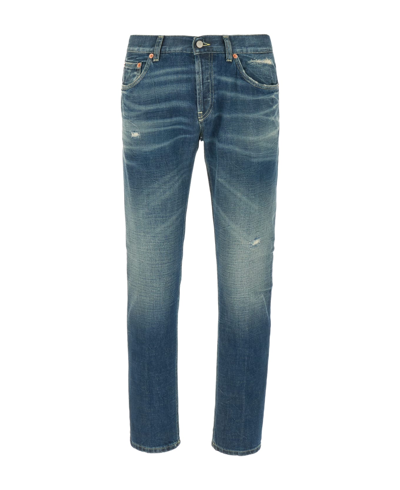 Jeans realized in distressed effect pure cotton denim enriched by metal D logo detail at the back. -Belt loops at the waist -Concealed buttons with a single visible button closure -Five classic pockets