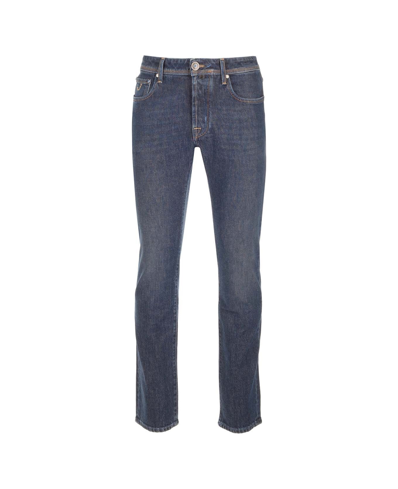 "Nick" jeans in dark denim from Jacob Cohen in cotton, slim model, five pockets, belt loops at the waist, tag on the back, supplied with scarf. Composition: 99% COTTON 1% SPANDEX - INLAY 65% POLYESTER 35% COTTON