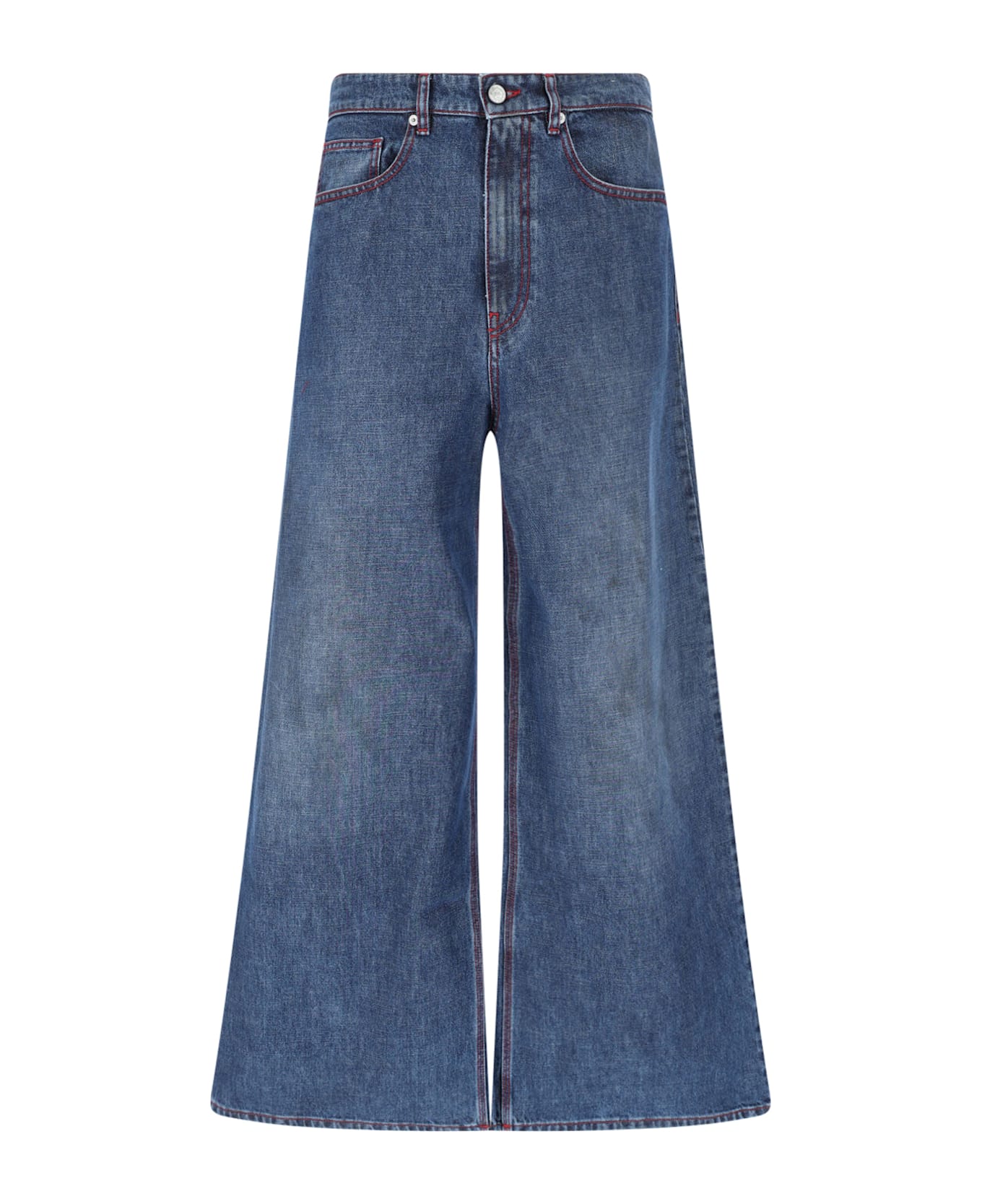 Erl wide jeans in blue denim with distressed wash, mid waist, belt loops, button and zip closure, five pockets, red stitching detail on the back, wide leg.
