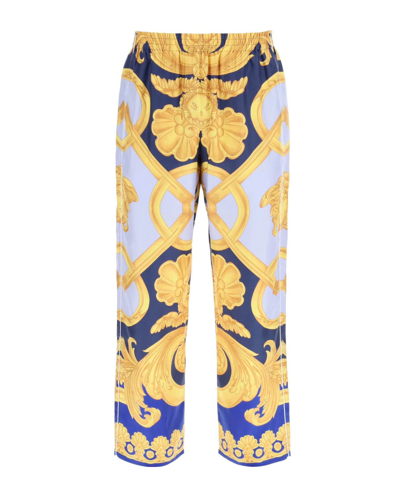 Versace silk twill pajama pants with Barocco 660 print, finished with a contrasting piping. Elasticized waist, side inseam pockets, loose fit. The model is 187 cm tall and wears a size IT 4. Composition: 100% SE