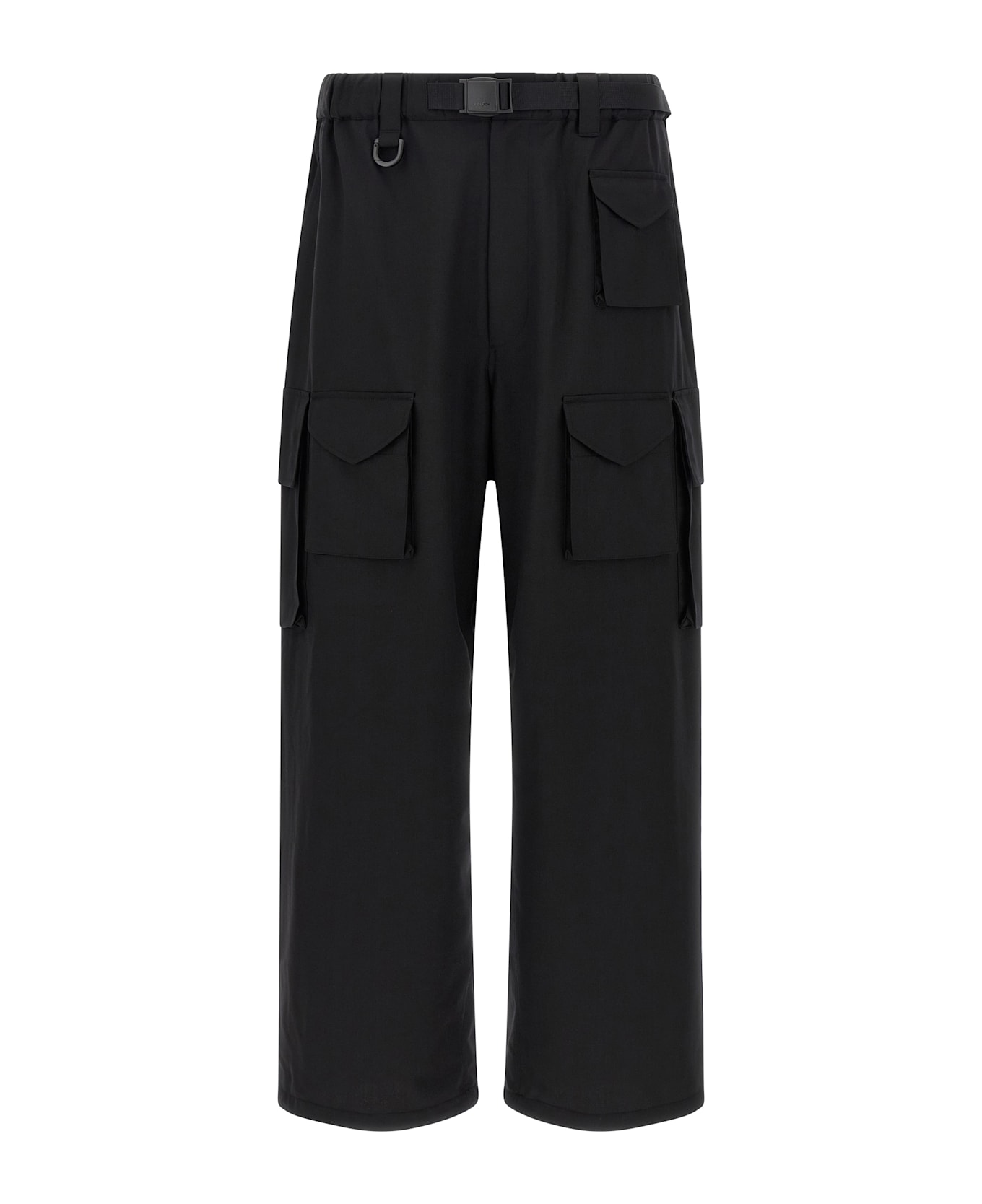 Cargo pants in wool blend with side pockets, zip and front button closure, removable integrated belt, wide leg, pockets, drawstring on the leg bottom. Composition: 70% polyester, 30% wool