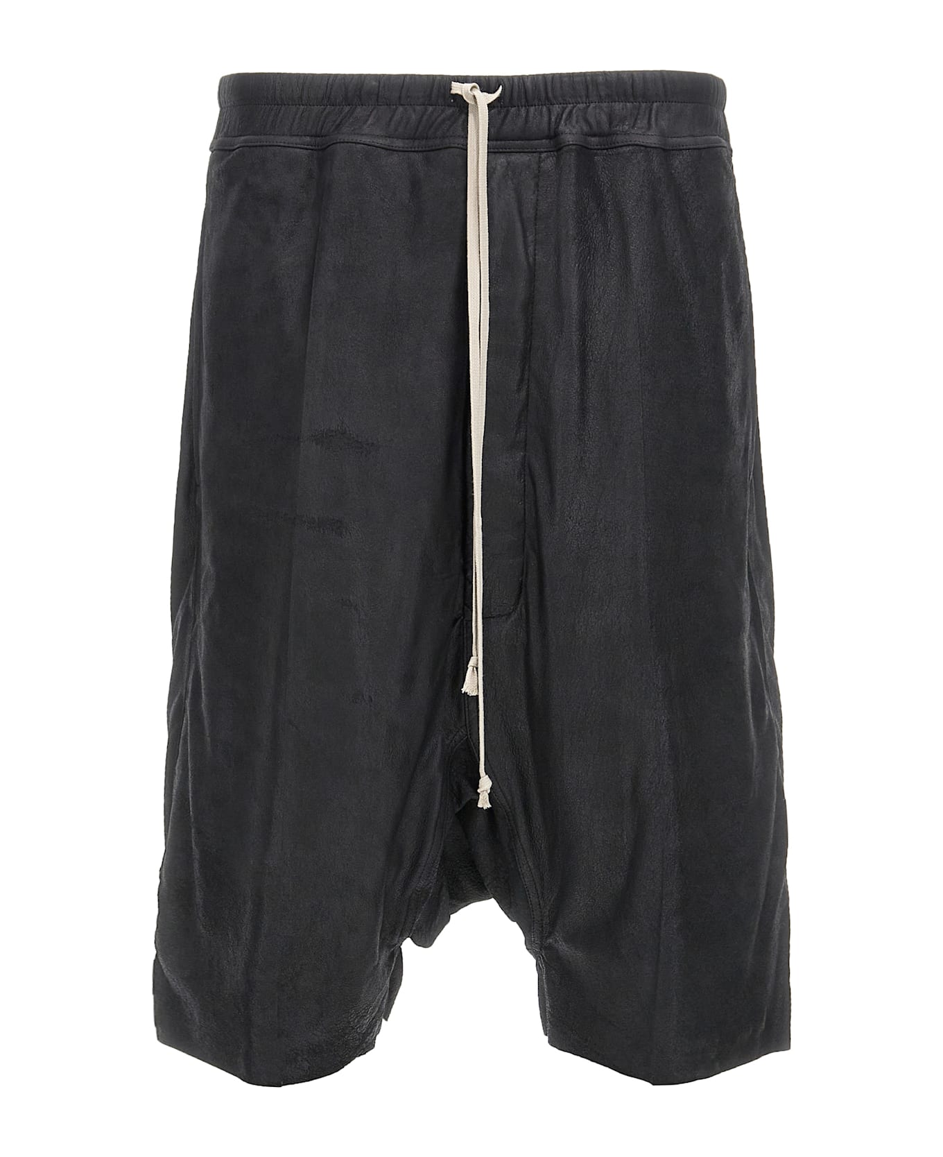 Leather 'Rick Pods' Bermuda shorts, low crotch design, elastic and drawstring waist, button flap, pockets.