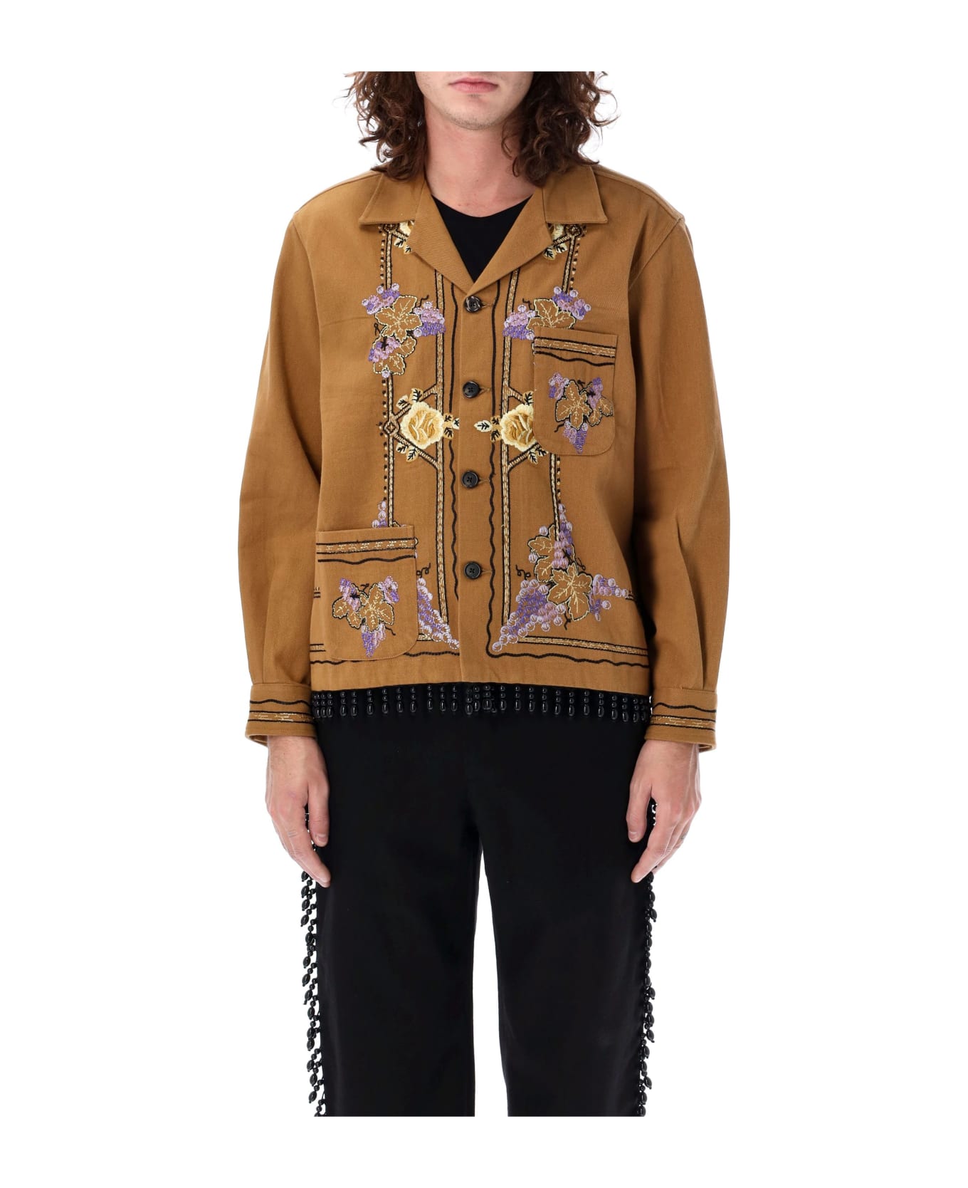 Autumn Royal Fringed Shirt By Bode. Featuring: Spread Collar Button Closure Two Front Pockets Embroidery At Front Adjustable Cuffs Fringed With Painted Wooden Beads Regular Fit Model Is 1,90 M Tall And He Is Wearing Size L