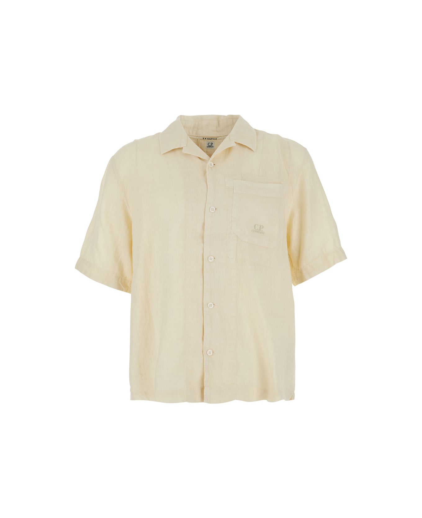 Shirt with Cuban collar. The color is beige. It features short sleeves with buttoned cuffs. Front button closure. Printed logo on the front. In Linen. Regular fit.