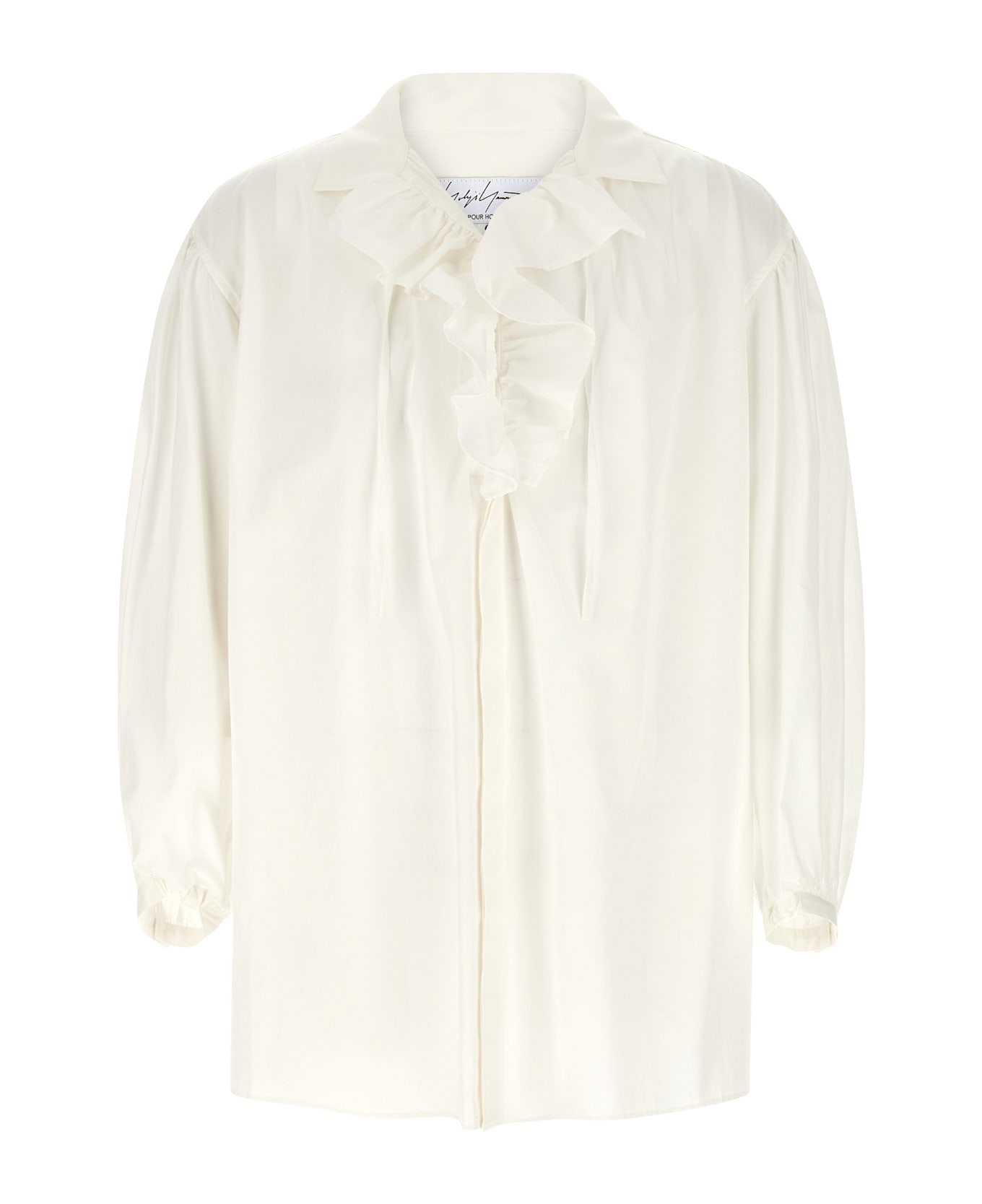 'Frilled Gather' cotton poplin shirt with raised collar and knotted laces, straight style curled at the shoulders, front closure with cufflink buttons and covered buttons, long sleeves curled on the cuffs.