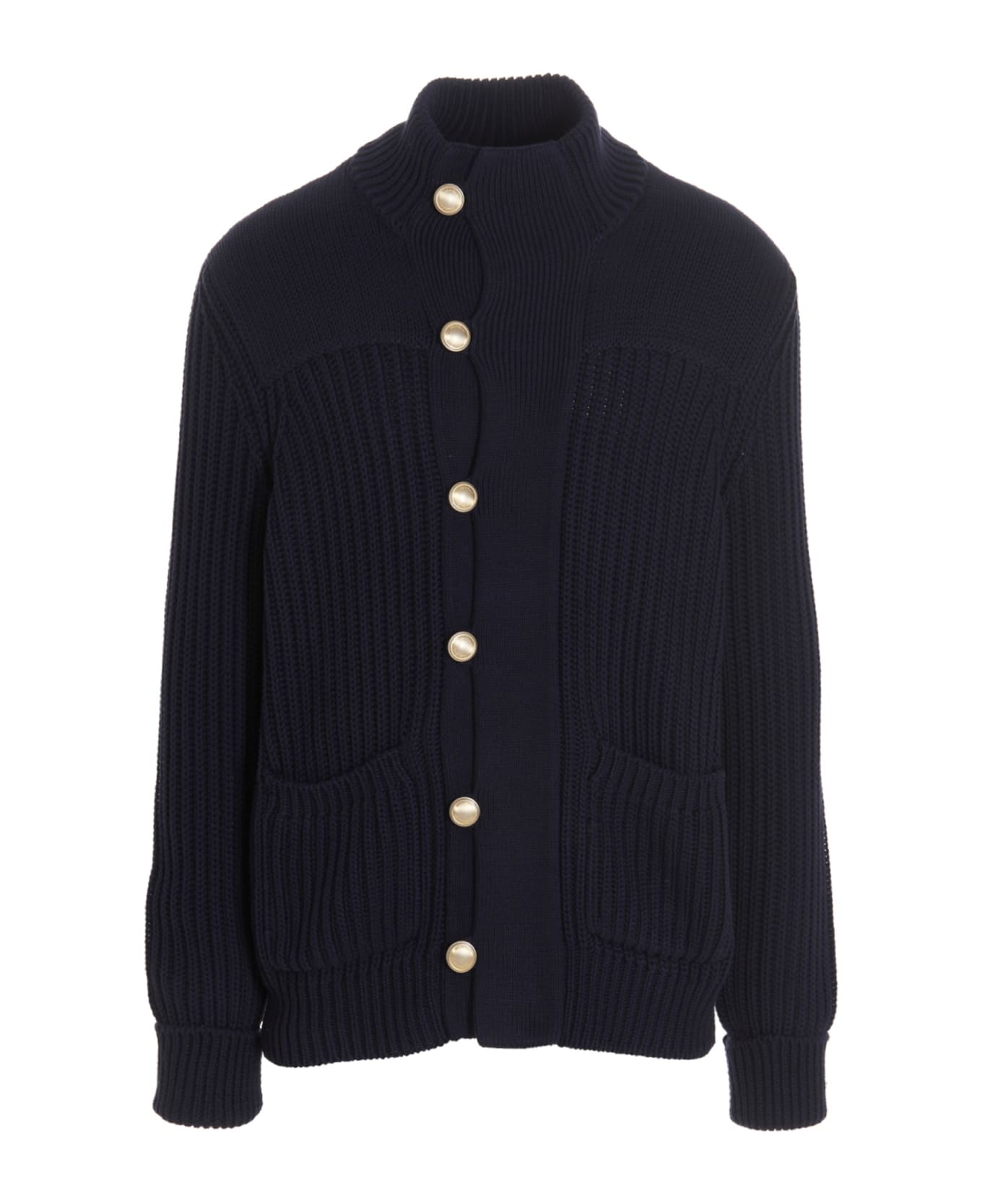 Chunky ribbed cotton cardigan with gold button closure, pockets, long sleeves with turn ups and a high neck. Composition: 100% cotton