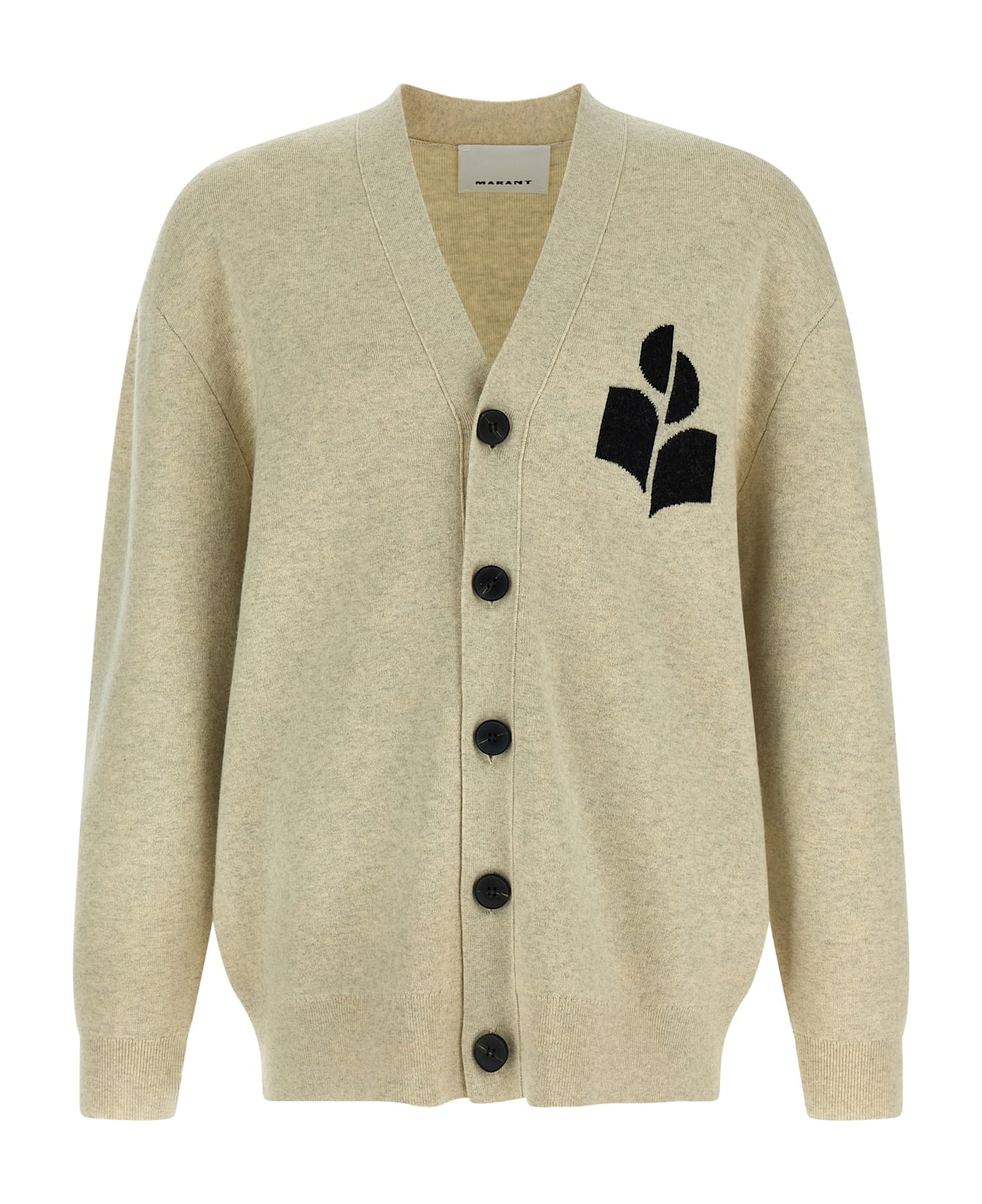 'Curtis' wool blend cardigan with V-neck, front button closure, contrast front logo intarsia, long cuffed sleeves. Composition: 41% co, 22% vi, 18% wo, 9% pa, 9% pl, 1% ea