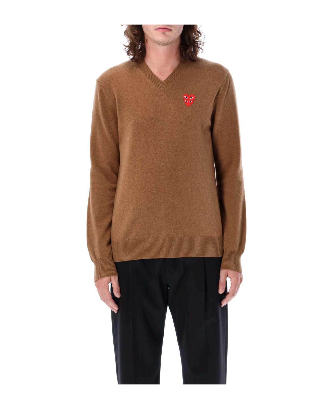 Double Heart Patch V-neck Sweater By Comme Des Garçons Play. Featuring: V-neck Long Sleeves Ribbed Neck, Cuffs And Hem Double Heart Logo Patch At Chest Cable Knit Trim Regular Fit Model Is 1,90 M Tall And He Is Wearing Size L