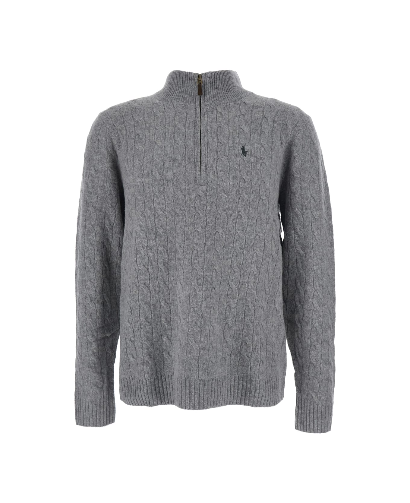 Sweater Grey High neck Long sleeves Front half zip closure Pony embroidery on the front Straight hem Ribbed trims Cable knit Wool and cashmere Regular fit